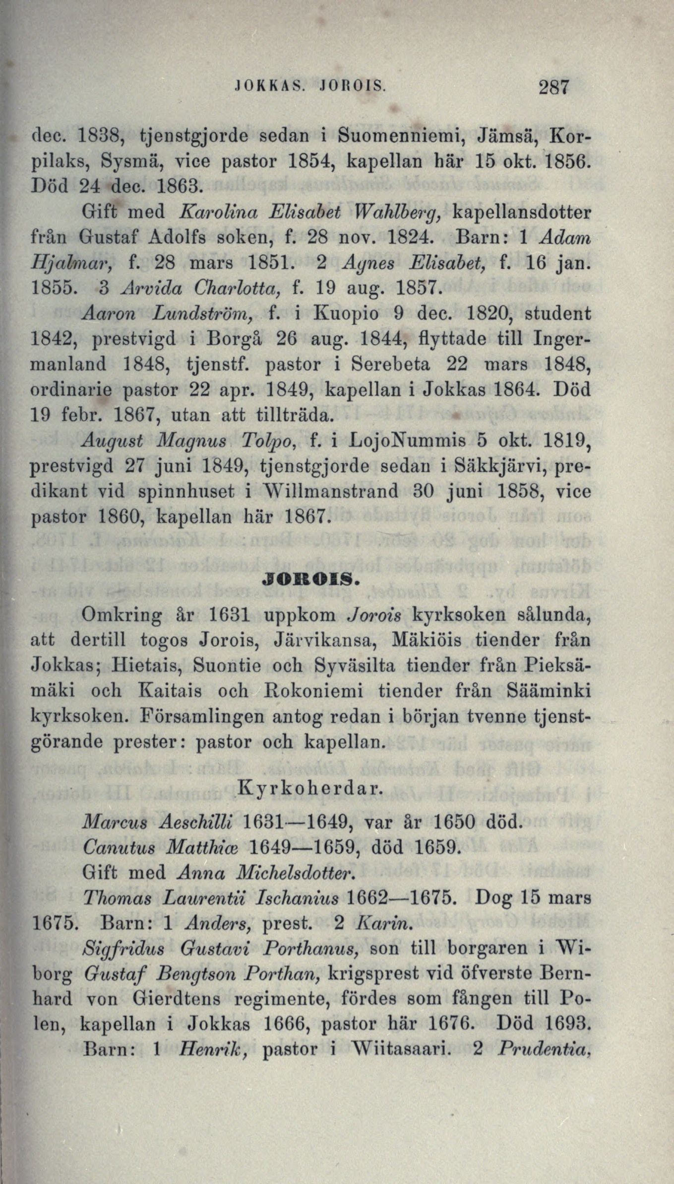 dec. 1838, tjenstgjorde sedan i Suomenniemi, Jämsä,