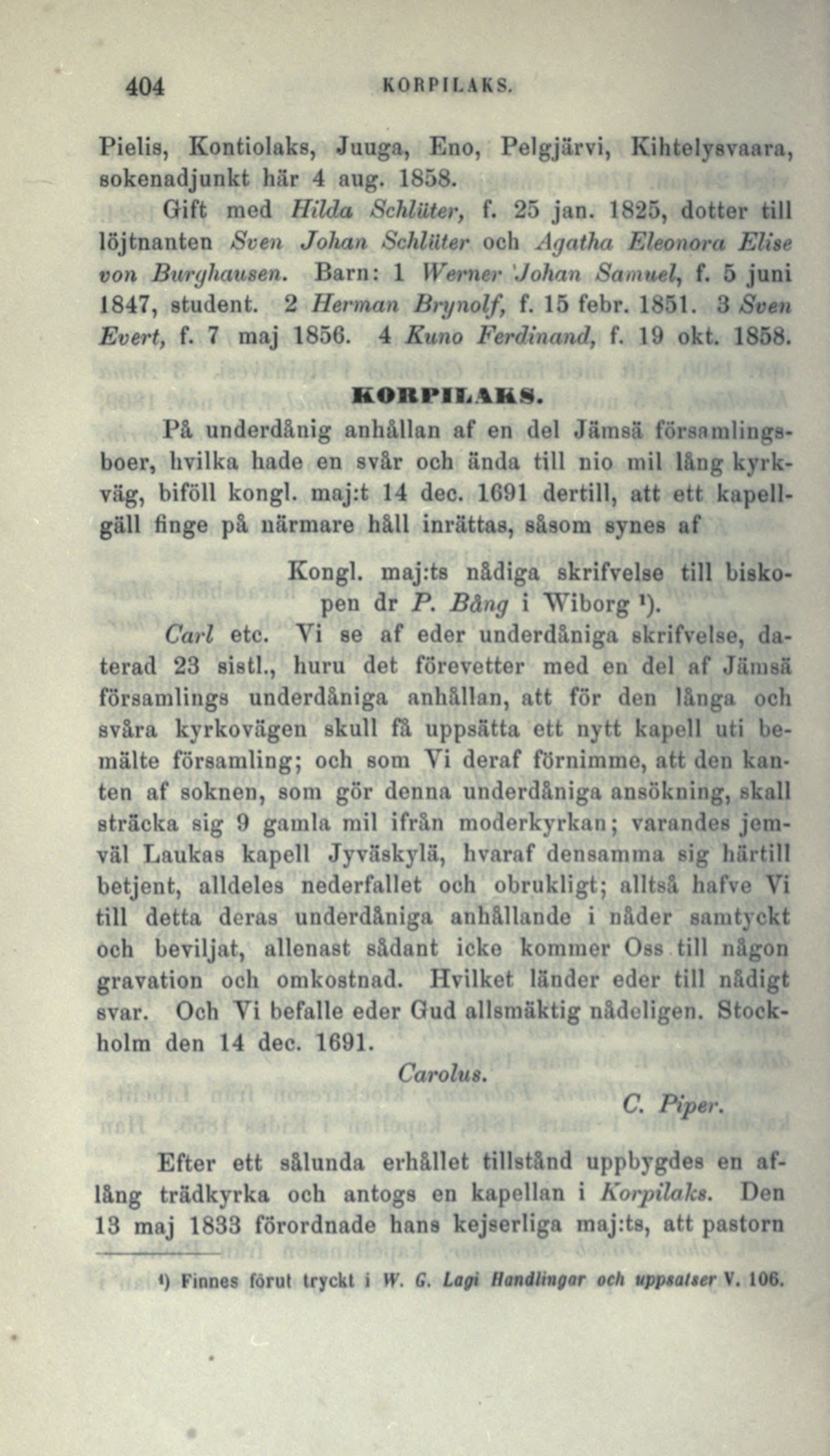 af-lång trädkyrka och antogs en kapellan i Korpilaks. Den