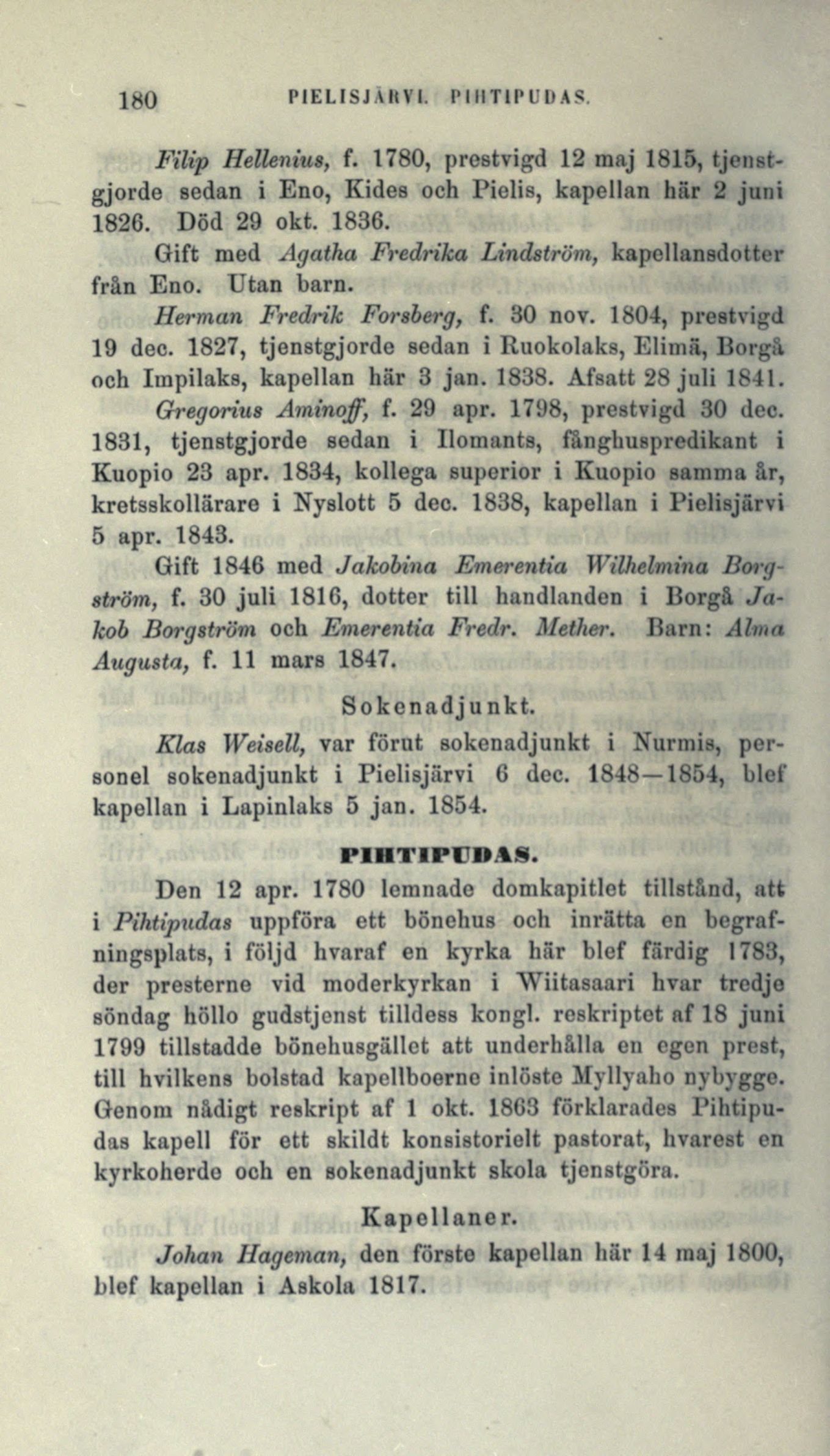 tjenstgjorde sedan i Eno, Kides och Pielis, kapellan här 2 juni