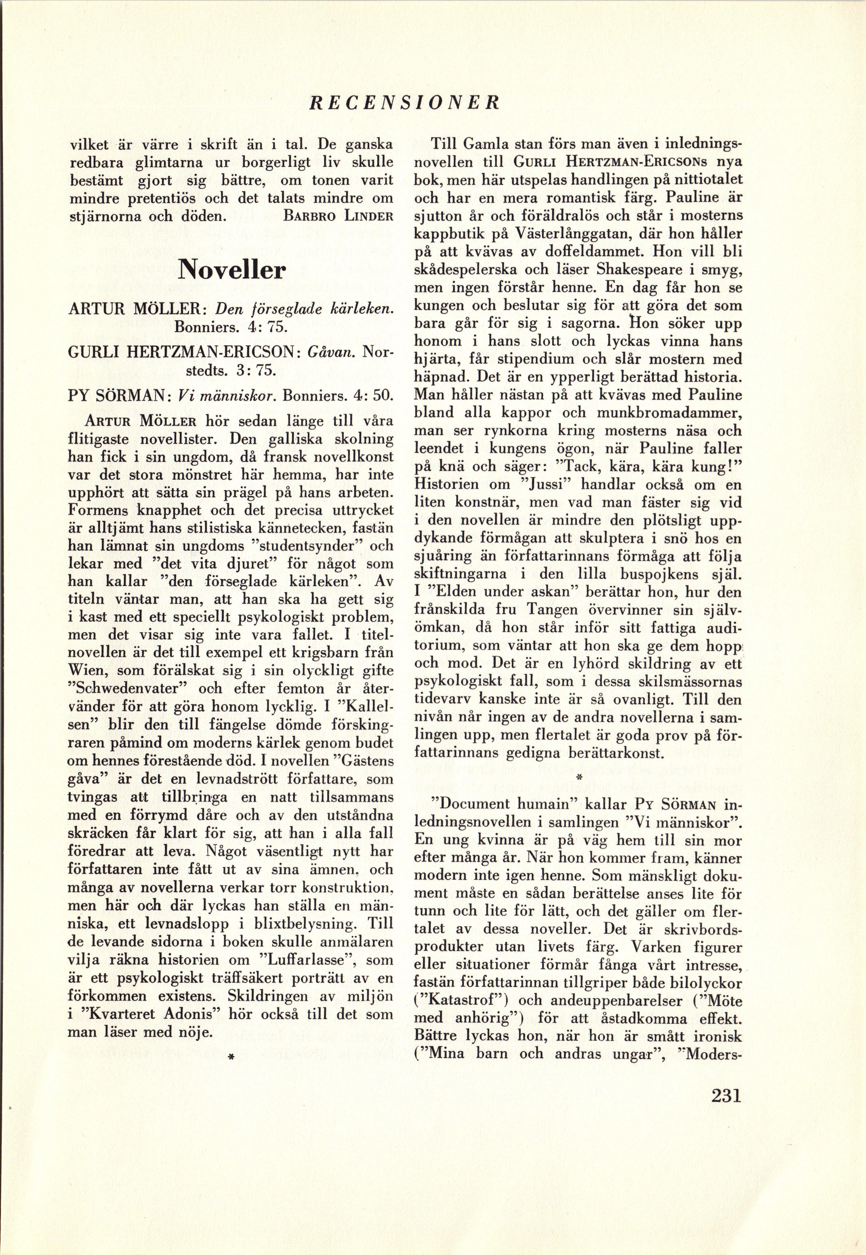 Full resolution (JPEG) - On this page / på denna sida - Anmälda böcker - Dixelius, Hildur, Skohandlare Sandin och hans barn; Björkman, Anna, Räddad idyll; Thunberg, Elsvig, Att leva, anmälda av Barbro Linder - Möller, Artur, Den förseglade kärleken; Hertzman-Ericson, Gurli, Gåvan; Sörman, Py, Vi människor, anmälda av Thure Nyman