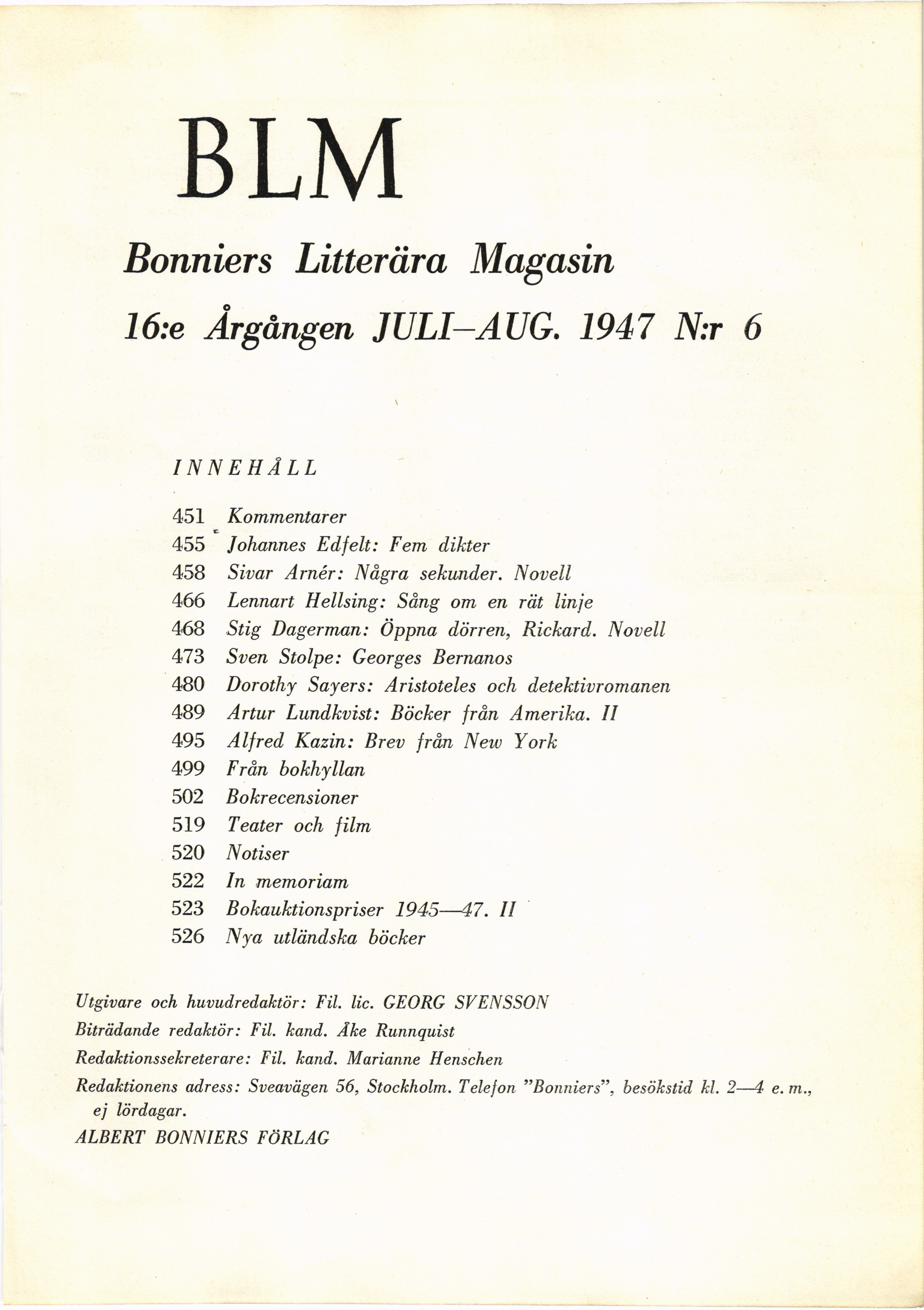 Redaktionens adress: Sveavägen 56, Stockholm. Telefon "Bonniers", besökstid kl. 2—4 e. m.,