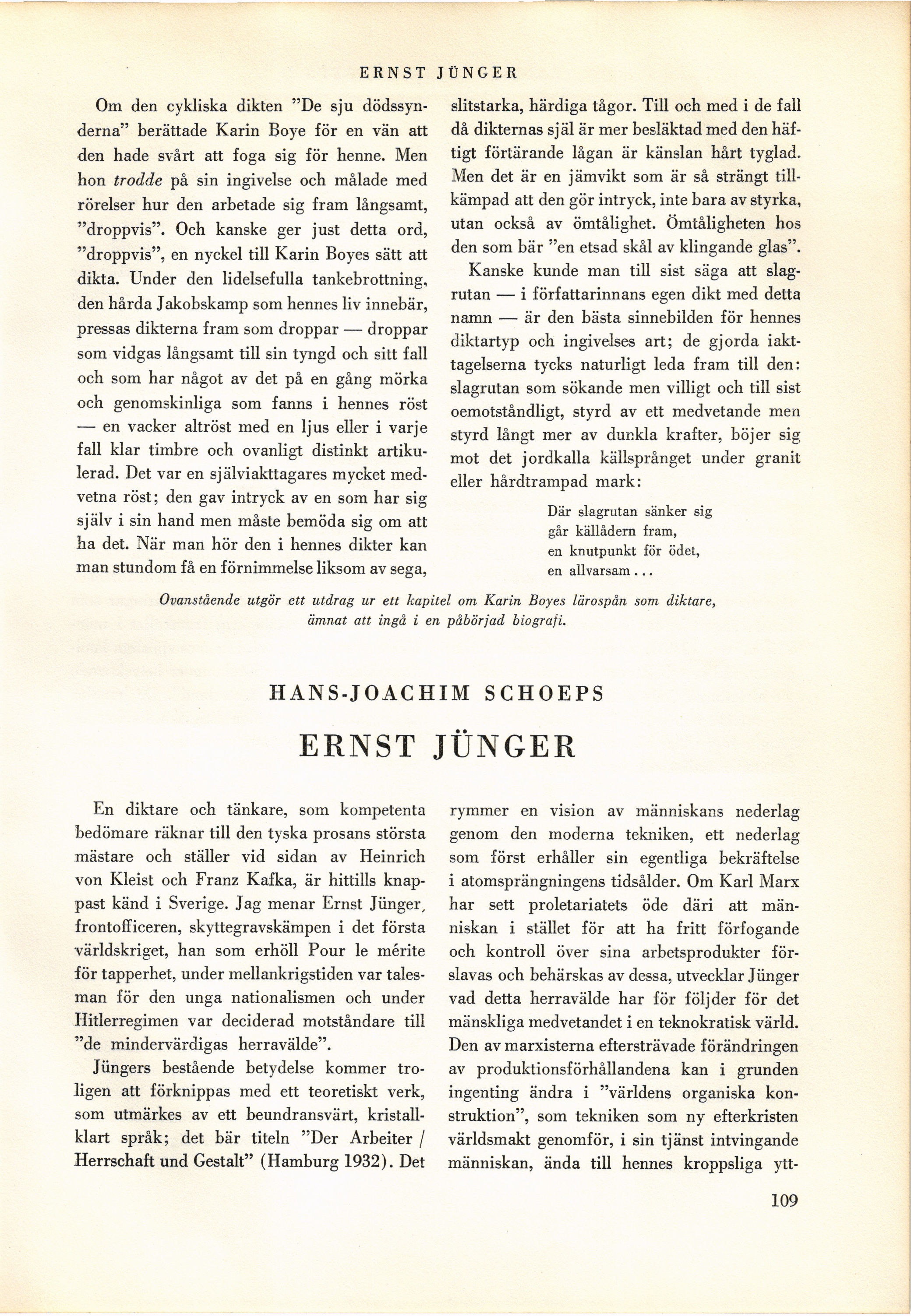 Full resolution (JPEG) - On this page / på denna sida - Februari. N:r 2 - Margit Abenius: Sångarönskan - Hans-Joachim Schoeps: Ernst Jünger. Översättning av Johannes Edfelt
