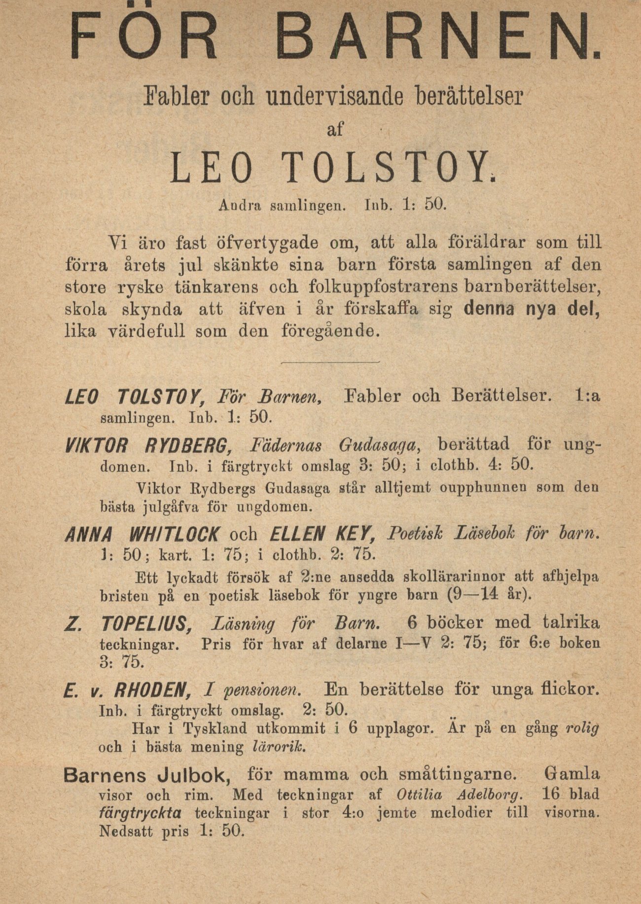 LEO TOLSTOY, För Barnen, Fabler och Berättelser. l:a