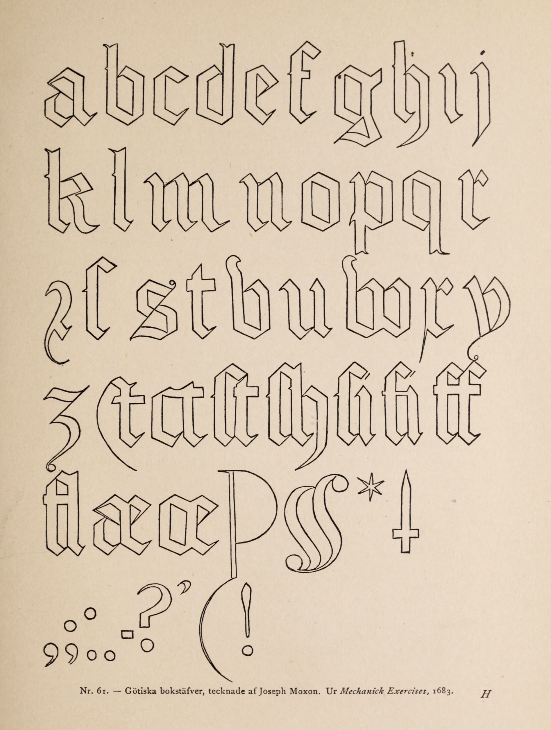Nr. 61. — Götiska bokstäfver, tecknade af Joseph Moxon. Ur Mechanick Exercises, 1683