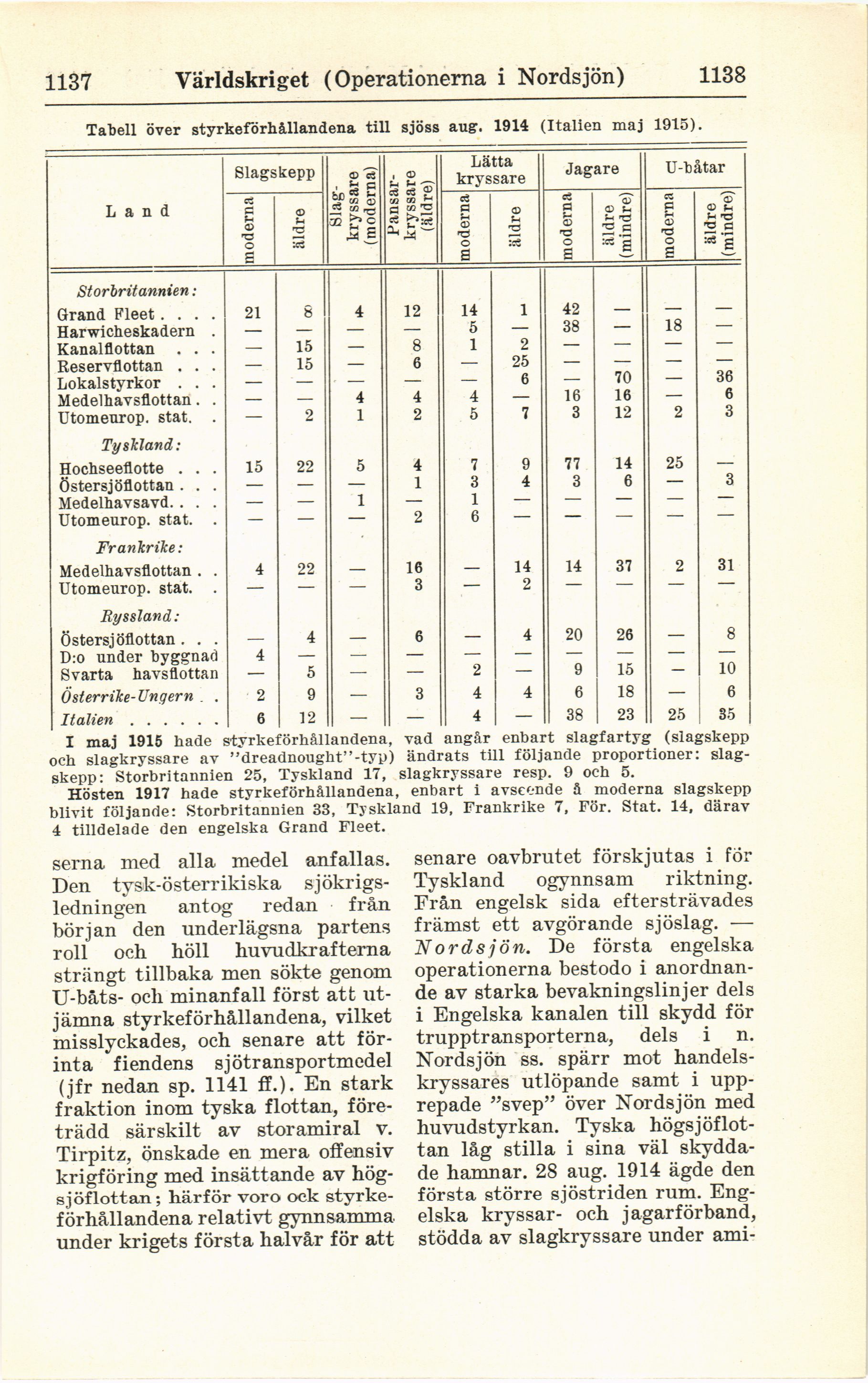 Tabell över styrkeförhållandena till sjöss aug. 1914 (Italien maj 1915).