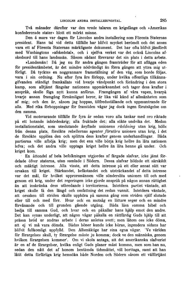 Full resolution (JPEG) - On this page / på denna sida - IV. Slaffrågans sista skede - 3. Söderns vedergällningssystem — fångarna i Andersonville; jämförelse mellan fångarnas behandling i Norden och Södern; abolitionisternas arbete för de frigifna slafvarnas hjälp; »freedmansbyrån»; dess verksamhet; lagstiftning till förmån för de svarte; omslag i krigslyckan till förmån för Norden; Grant utnämd till öfverbefälhafvare, februari 1864; Shermans tåg genom Georgien; Söderns hjälpkällor slut; önskan om fred; strid mellan demokrater och republikaner i Norden; Lincolns fiender; presidentvalet 1864; Lincoln återvald; Södern begär fred; konferensen å Hampton Roads; Lincolns andra installation; hans budskap