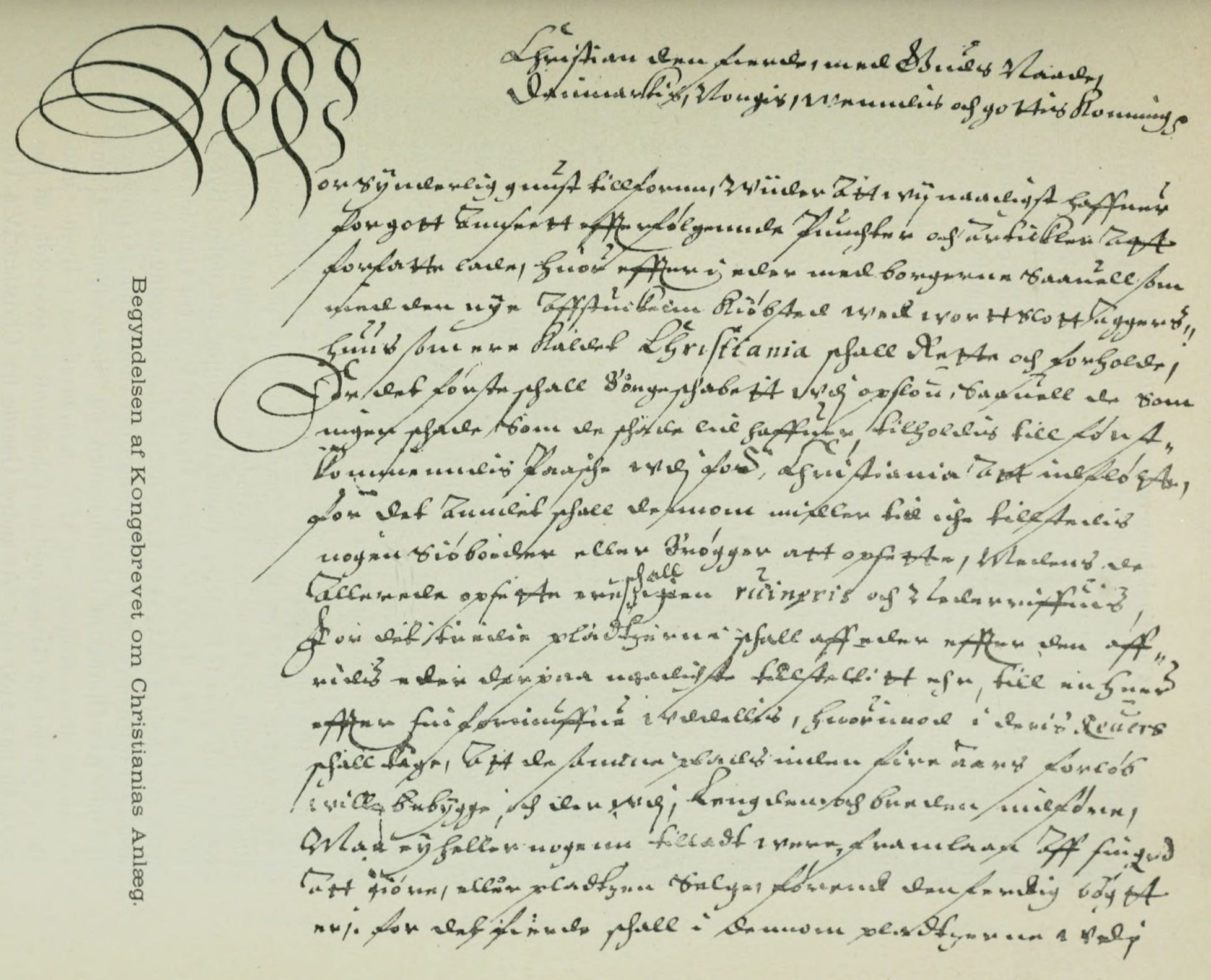 | Begyndelsen af Kongebrevet om Christianias Anlæg. |