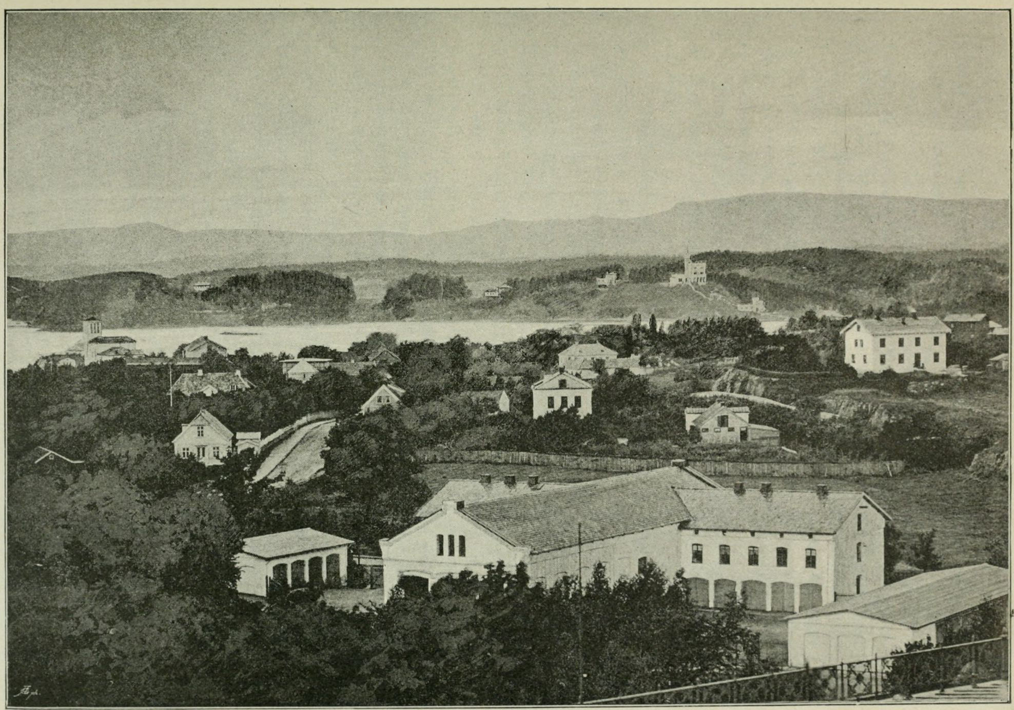 | Udsigt fra Slotstaget over Drammenveien med Omgivelser i 1860-Aarene, før Anlægget af Incognitogaden og Bebyggelsen af Parkveien. (De kongelige Stalde i Forgrunden.) |
