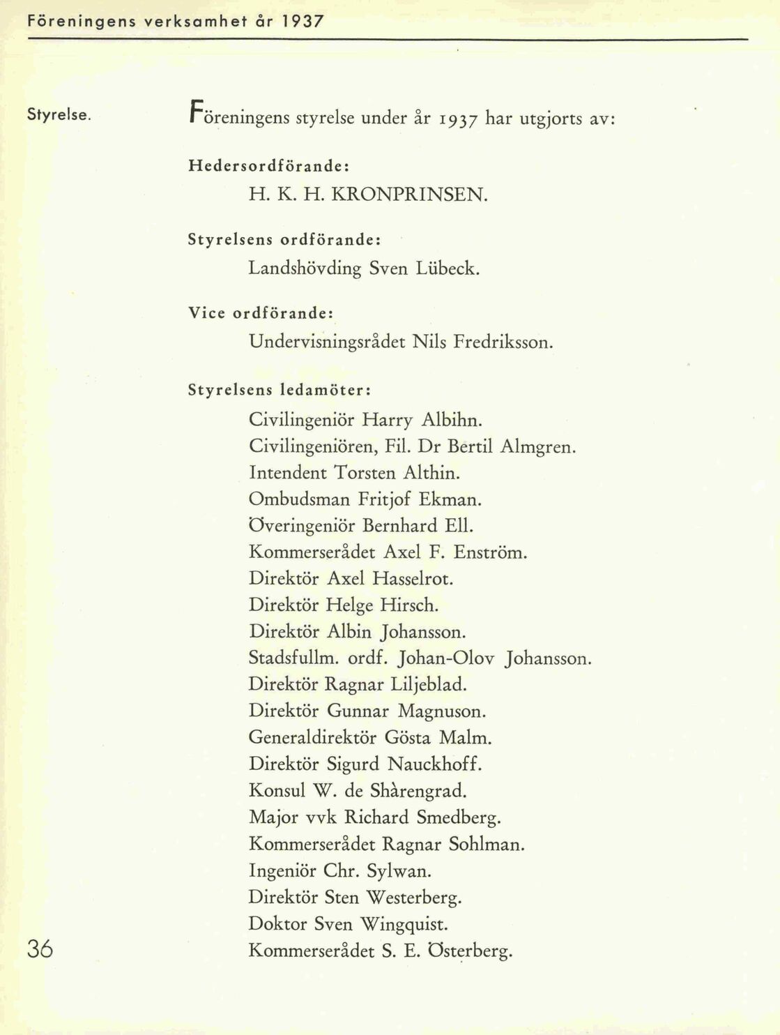 Styrelse. F öreningens styrelse under år 1937 har utgjorts av: