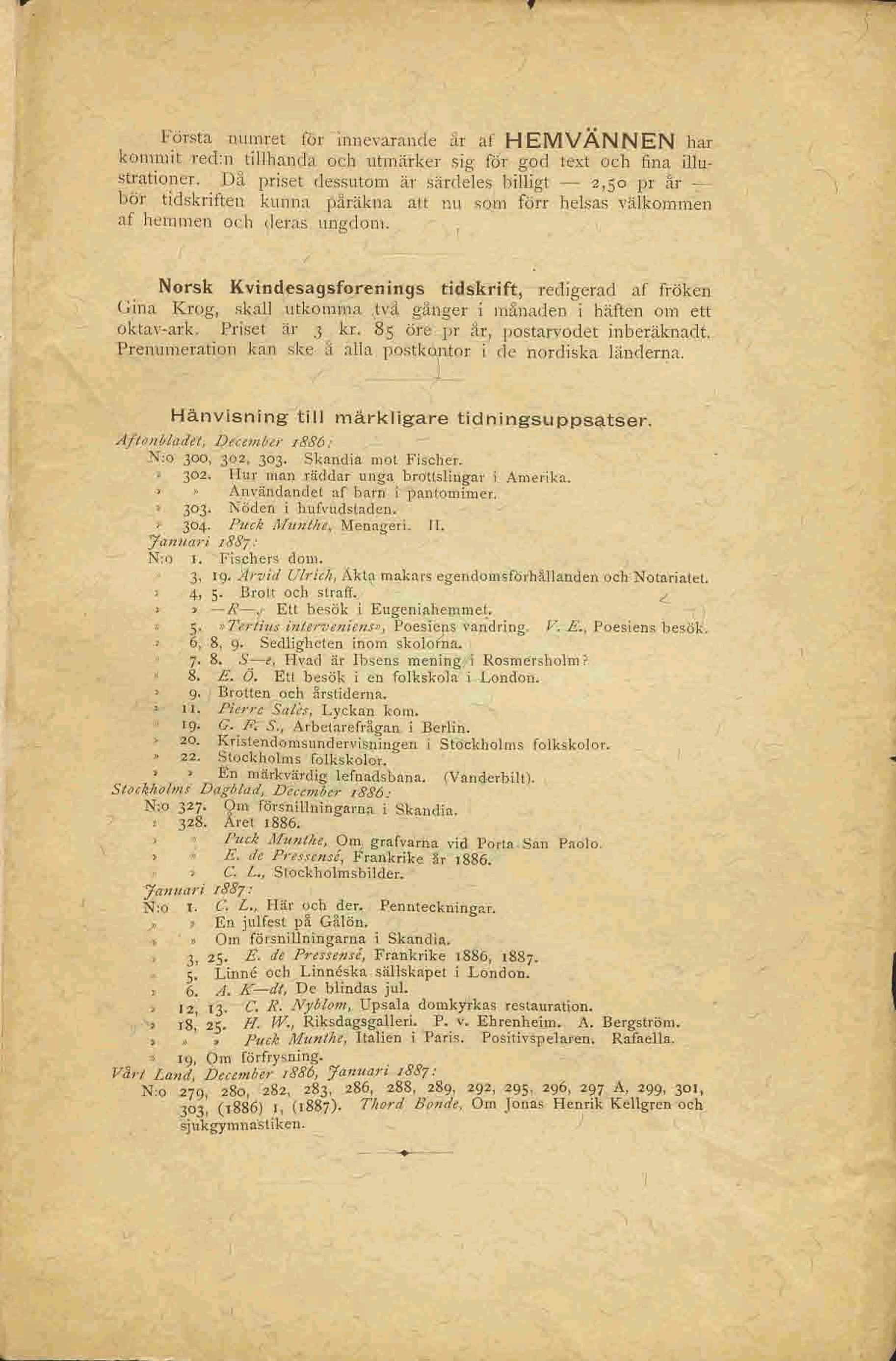 Full resolution (JPEG) - On this page / på denna sida - Häfte II. Februari 1887 - Hemvännen - Norsk Kvindesagsforenings tidskrift - Hänvisning till märkligare tidningsuppsatser. December 1886. January 1887