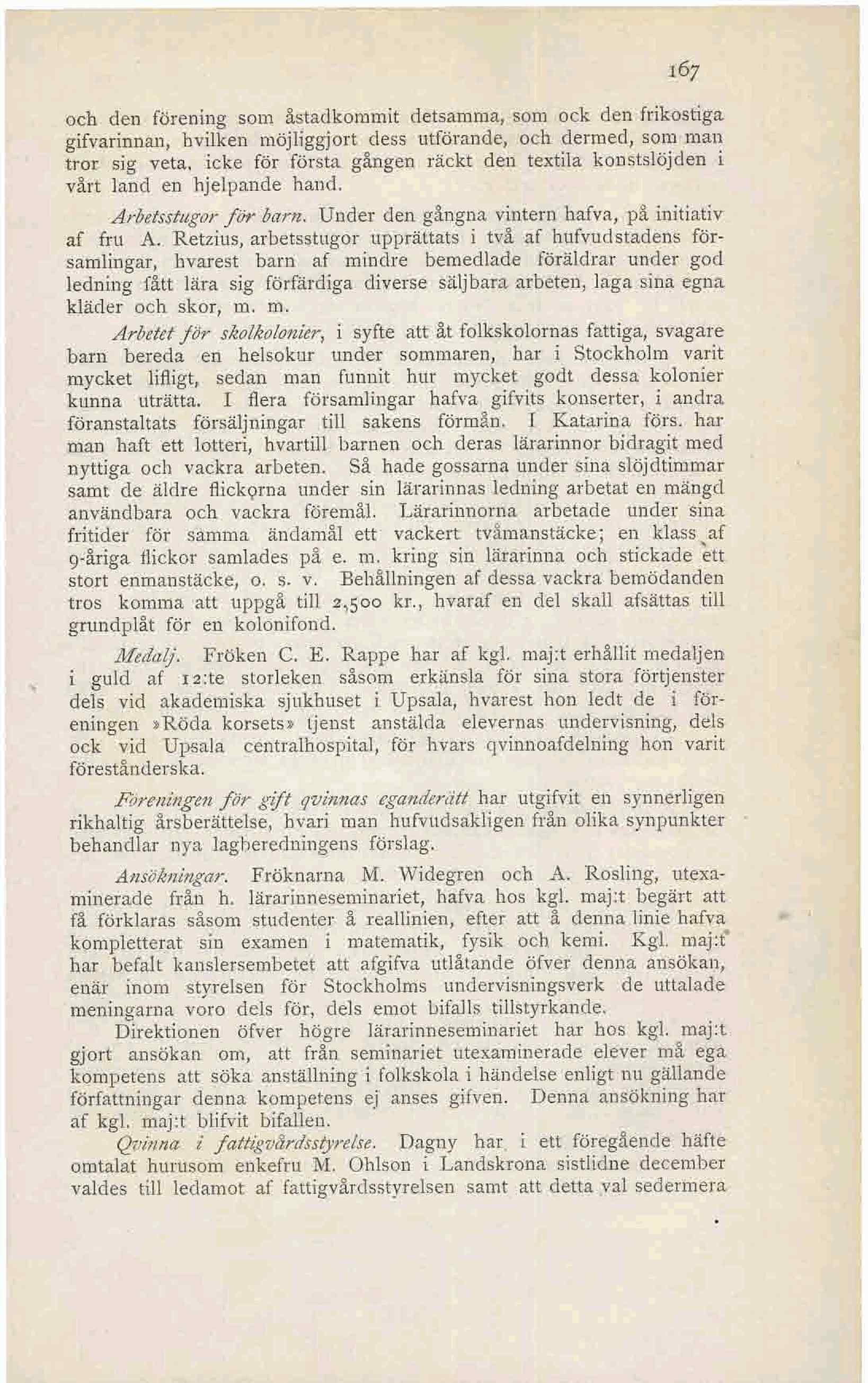 af fru A. Retzius, arbetsstugor upprättats i två af hufvudstadens