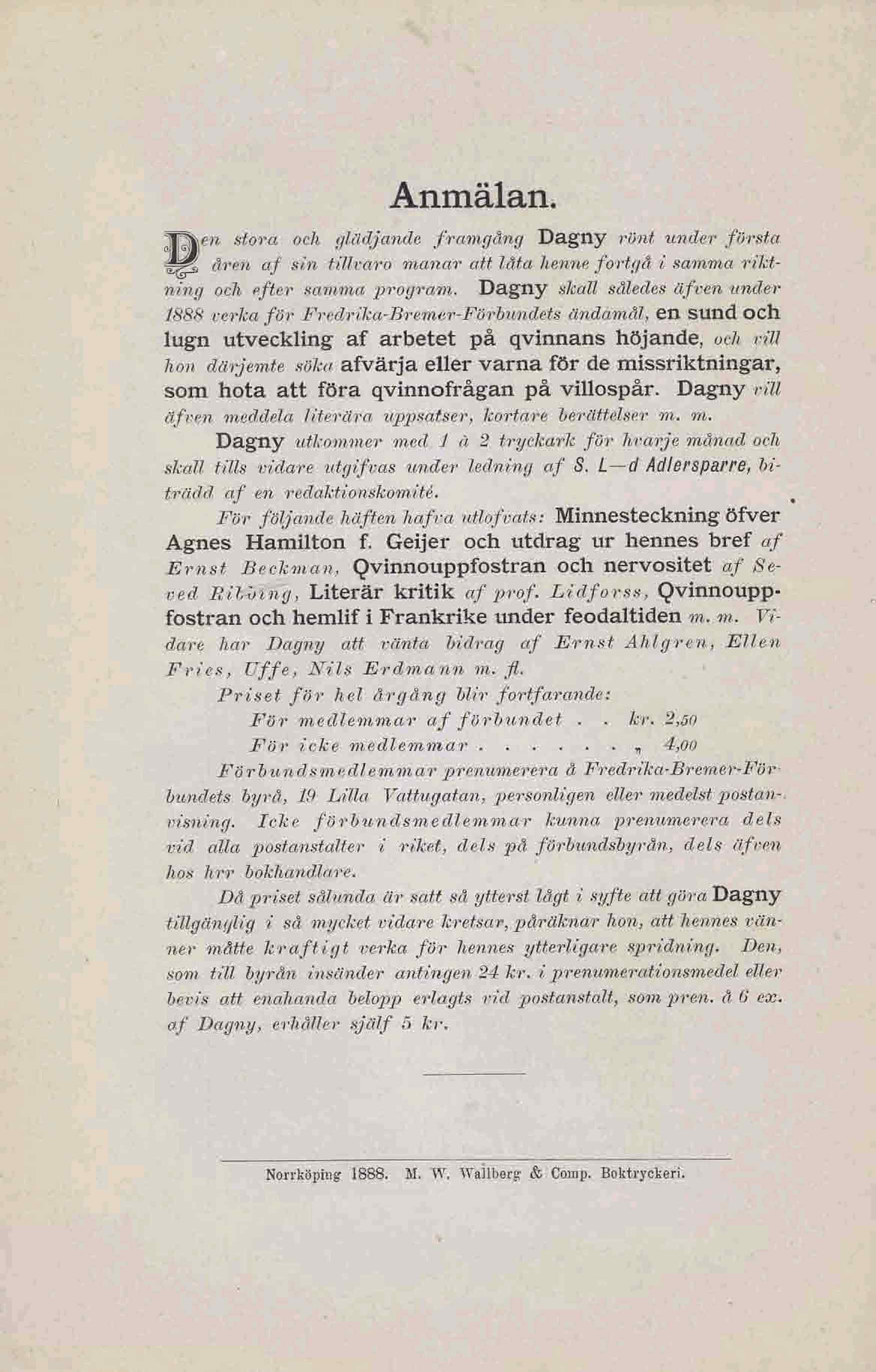 Norrköping- 1888. M. YV. Wallberg & Comp. Boktryckeri.