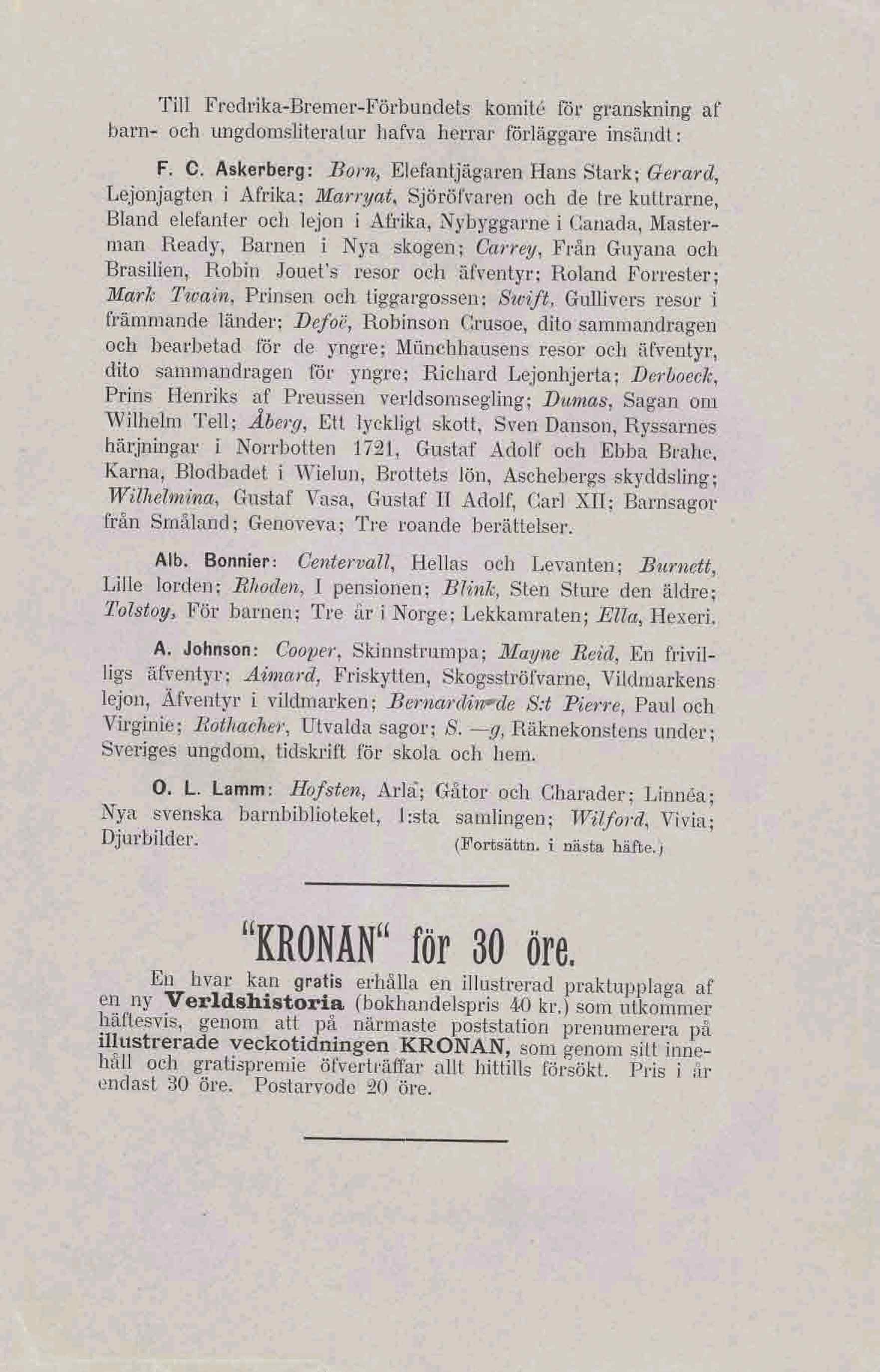 barn- och ungdomsliteralur hafva herrar förläggare insändt: