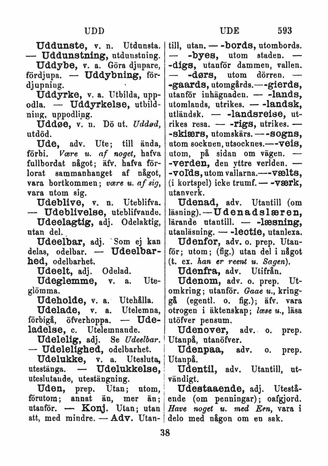 Uden, prep. Utan; utom,