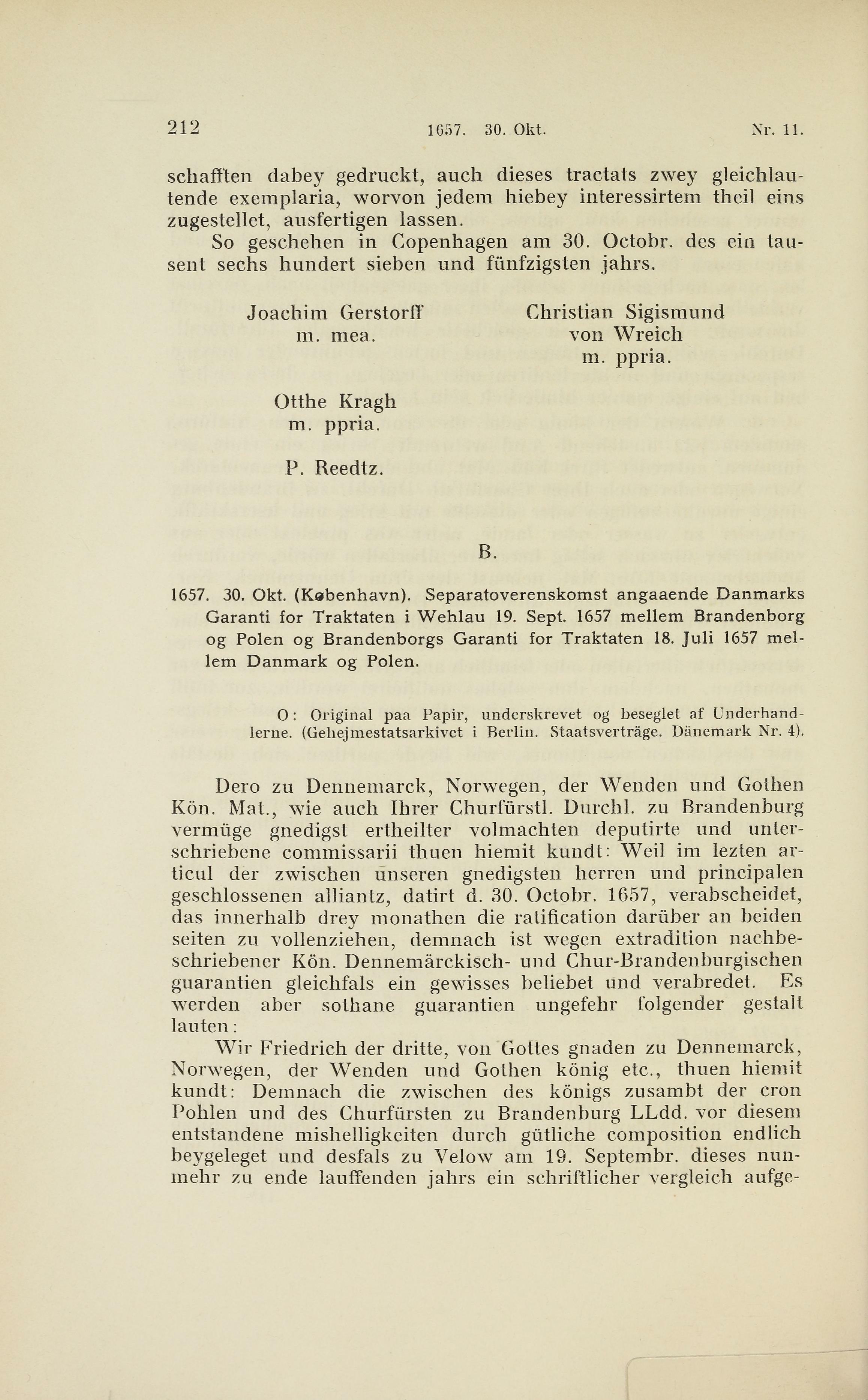 1657. 30. Okt. (København). Separatoverenskomst angaaende Danmarks