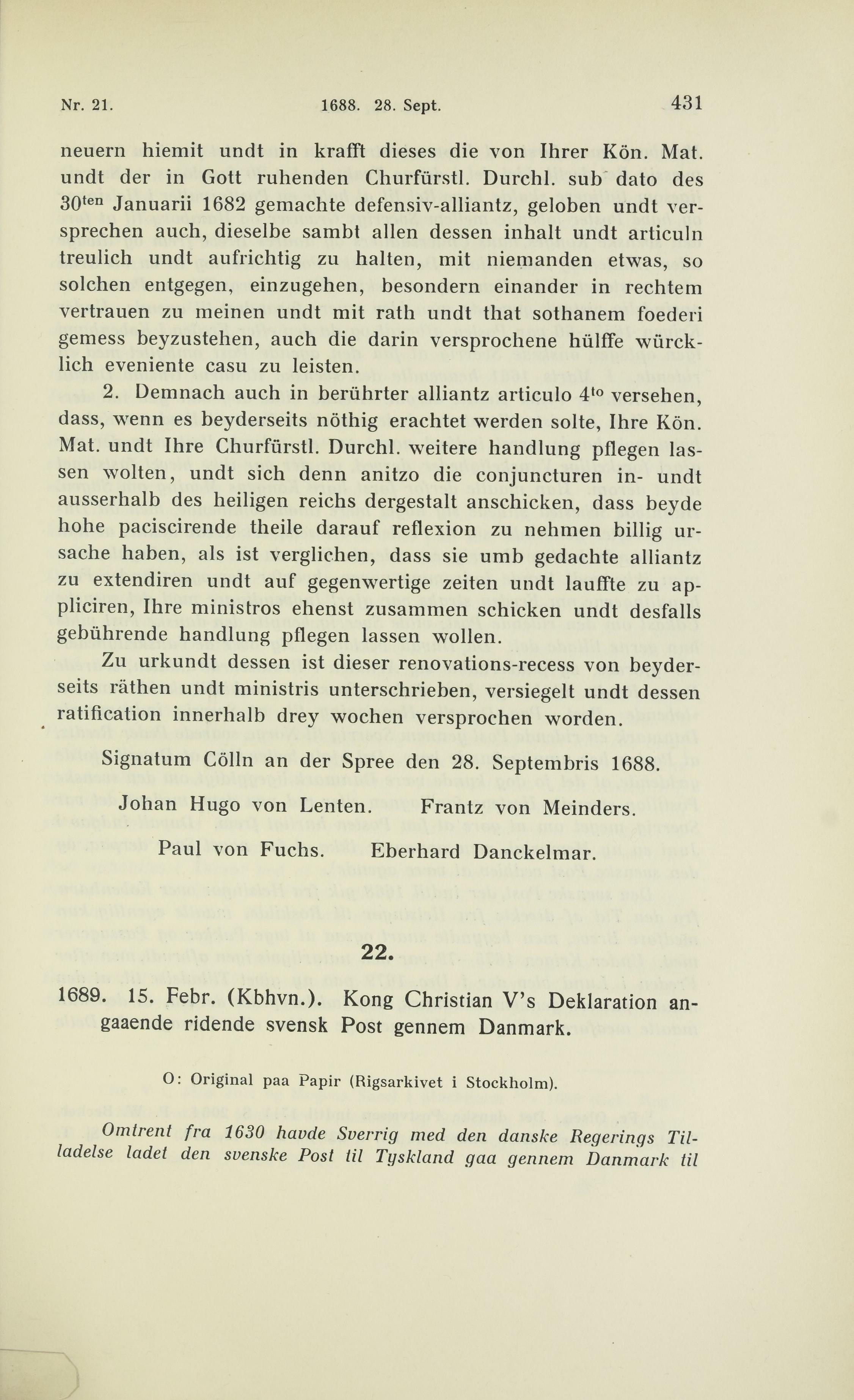 Signatum Colln an der Spree den 28. Septembris 1688.