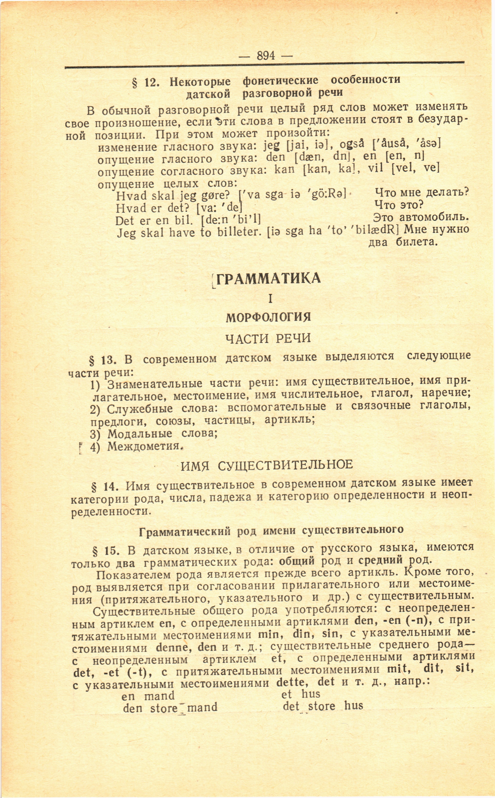 Full resolution (JPEG) - On this page / på denna sida - А. С. Новакович. Краткий очерк фонетики, грамматики и словообразования датского языка - Фонетика - § 12. Некоторые фонетические особенности датской разговорной речи - Грамматика - I. Морфология - § 13. Части речи - § 14. Имя существительное - § 15. Грамматический род имени существительного