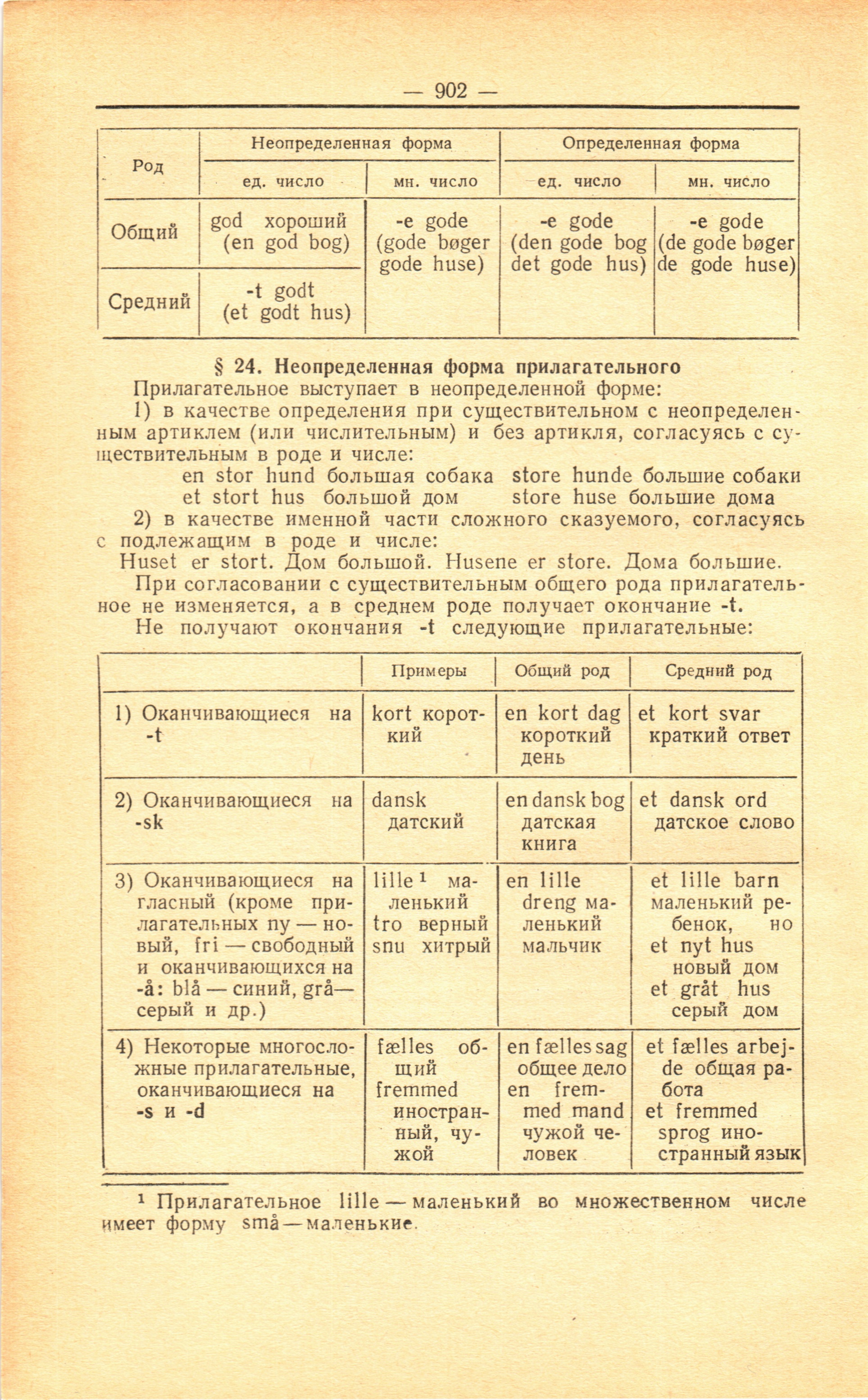 Full resolution (JPEG) - On this page / på denna sida - А. С. Новакович. Краткий очерк фонетики, грамматики и словообразования датского языка - Грамматика - I. Морфология - § 23. Имя прилагательное - § 24. Неопределенная форма прилагательного