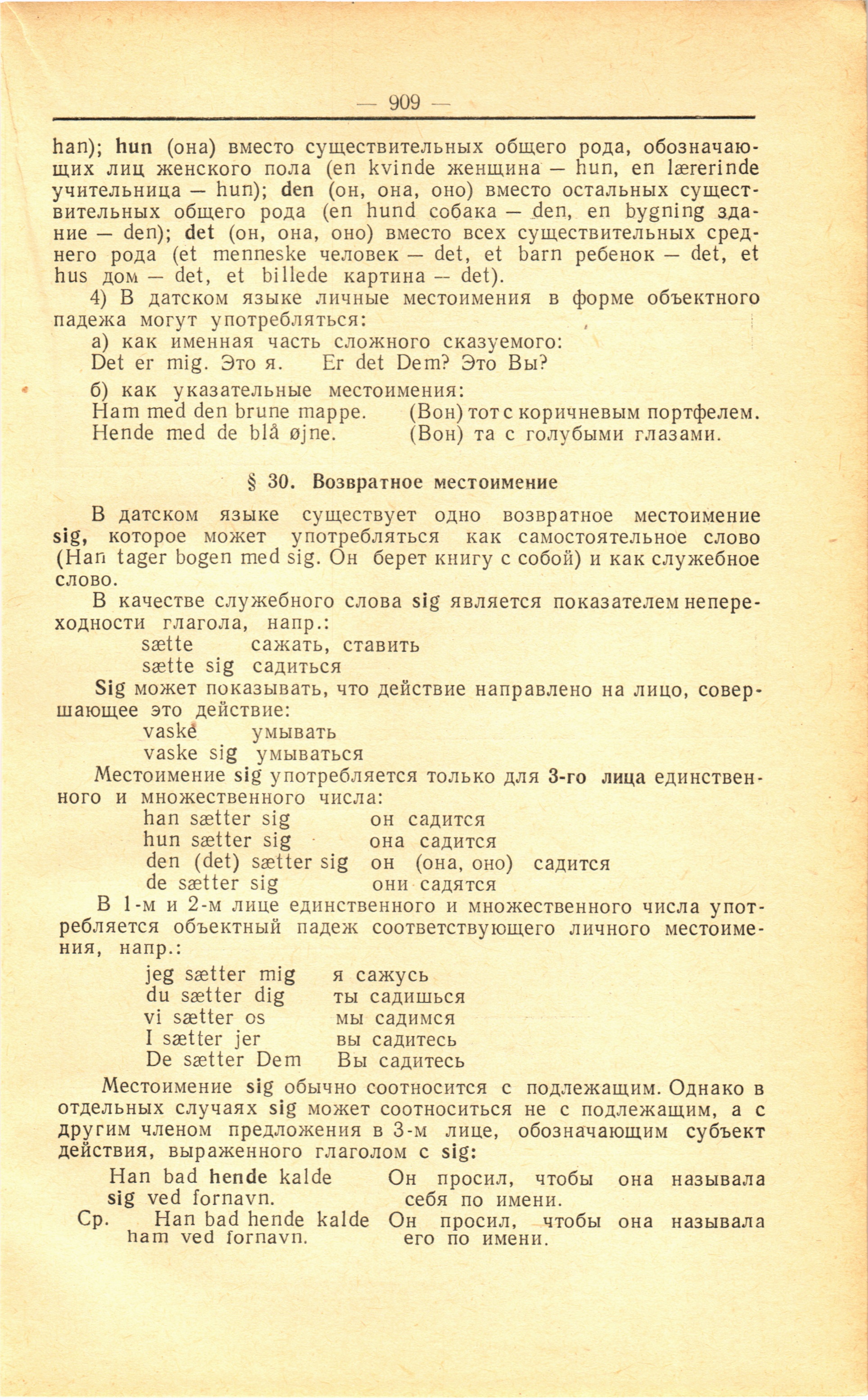 Full resolution (JPEG) - On this page / på denna sida - А. С. Новакович. Краткий очерк фонетики, грамматики и словообразования датского языка - Грамматика - I. Морфология - § 29. Личные местоимения - § 30. Возвратное местоимение