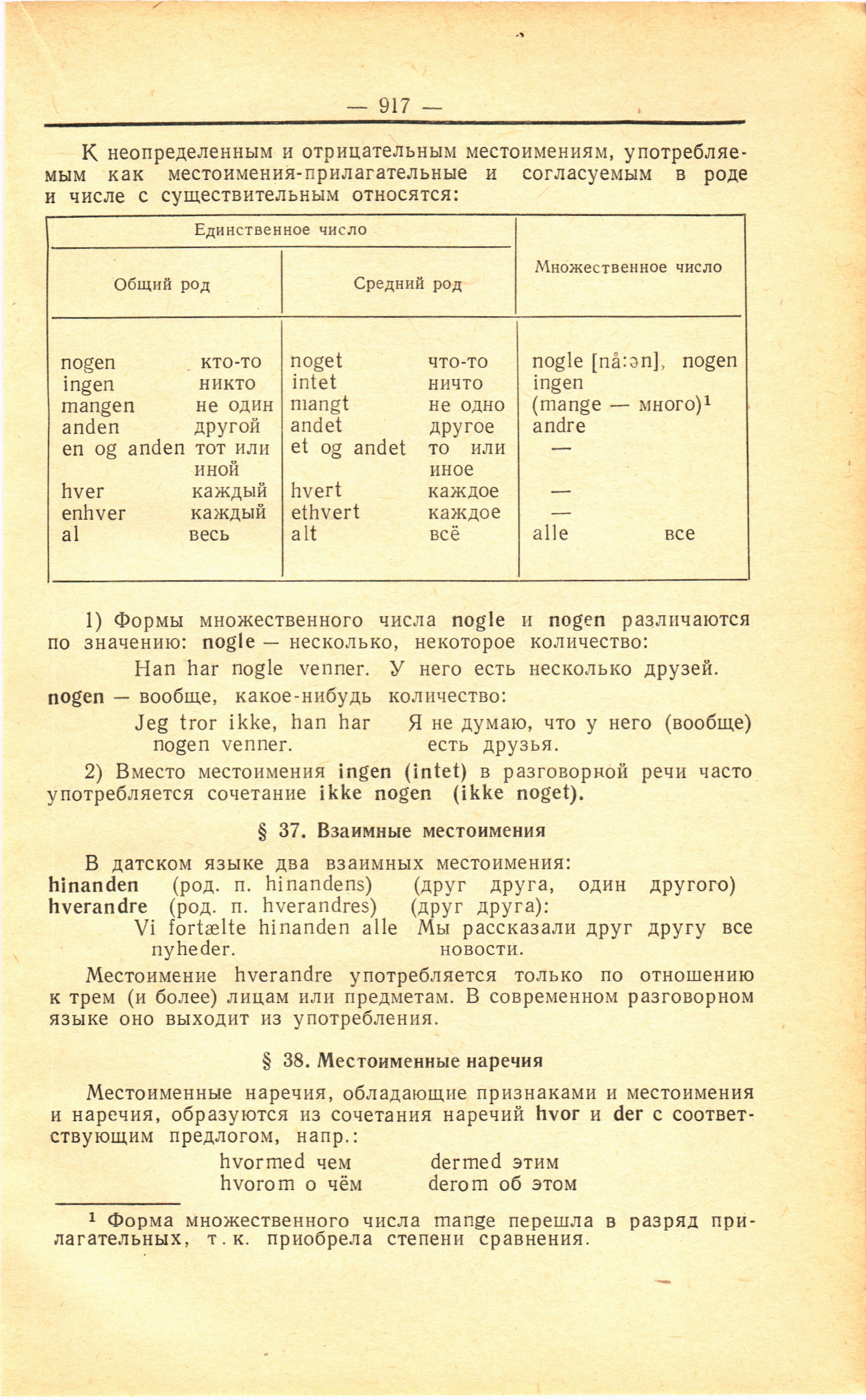Full resolution (JPEG) - On this page / på denna sida - А. С. Новакович. Краткий очерк фонетики, грамматики и словообразования датского языка - Грамматика - I. Морфология - § 36. Неопределенные и отрицательные местоимения - § 37. Взаимные местоимения - § 38. Местоименные наречия