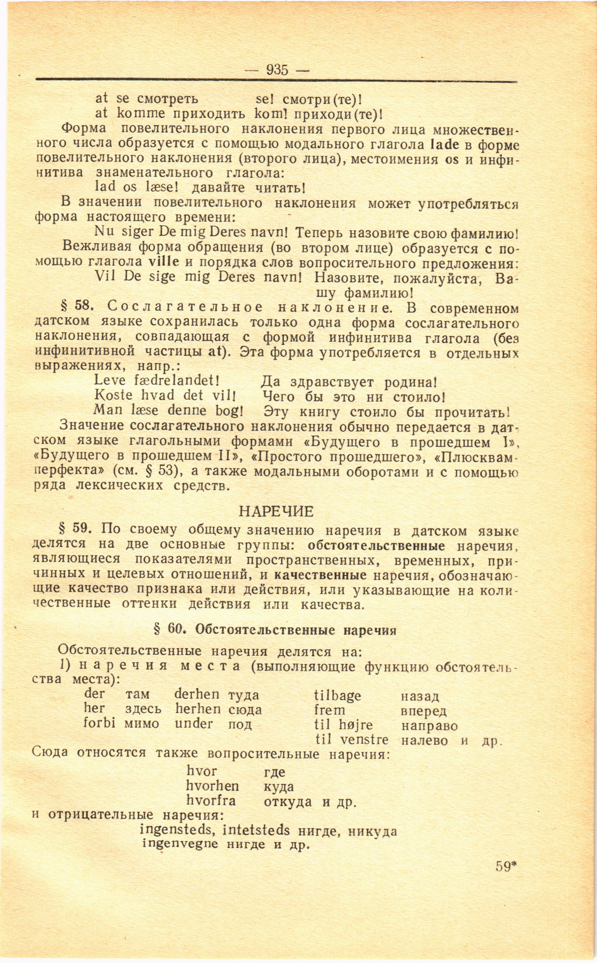 Full resolution (JPEG) - On this page / på denna sida - А. С. Новакович. Краткий очерк фонетики, грамматики и словообразования датского языка - Грамматика - I. Морфология - § 57. Повелительное наклонение - § 58. Сослагательное наклонение - § 59. Наречие - § 60. Обстоятельственные наречия