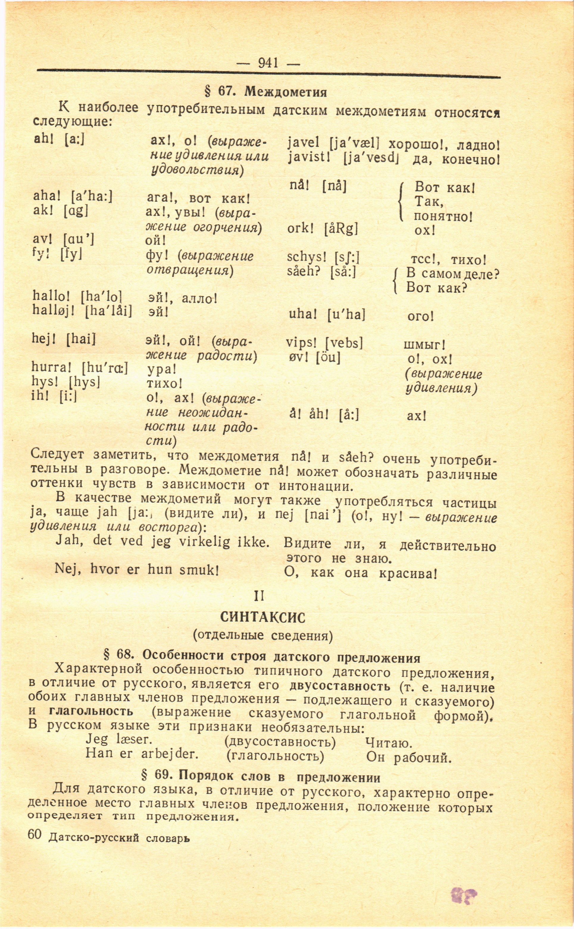 Full resolution (JPEG) - On this page / på denna sida - А. С. Новакович. Краткий очерк фонетики, грамматики и словообразования датского языка - Грамматика - I. Морфология - § 67. Междометия - II. Синтаксис - § 68. Особенности строя датского предложения - § 69. Порядок слов в предложении