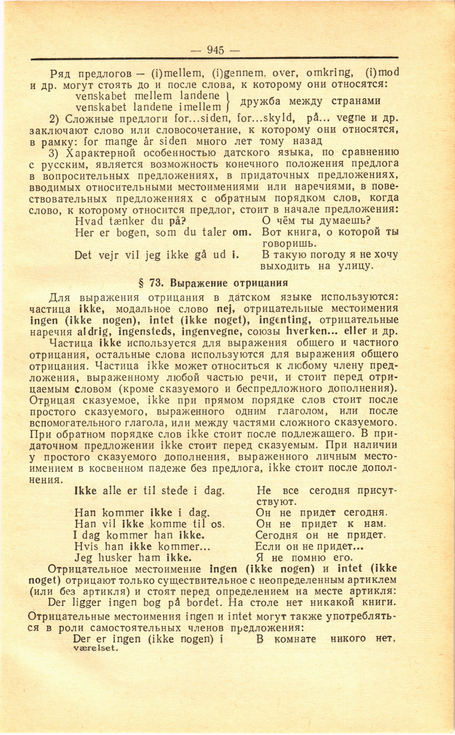 Full resolution (JPEG) - On this page / på denna sida - А. С. Новакович. Краткий очерк фонетики, грамматики и словообразования датского языка - Грамматика - § 72. Место предлога - § 73. Выражение отрицания