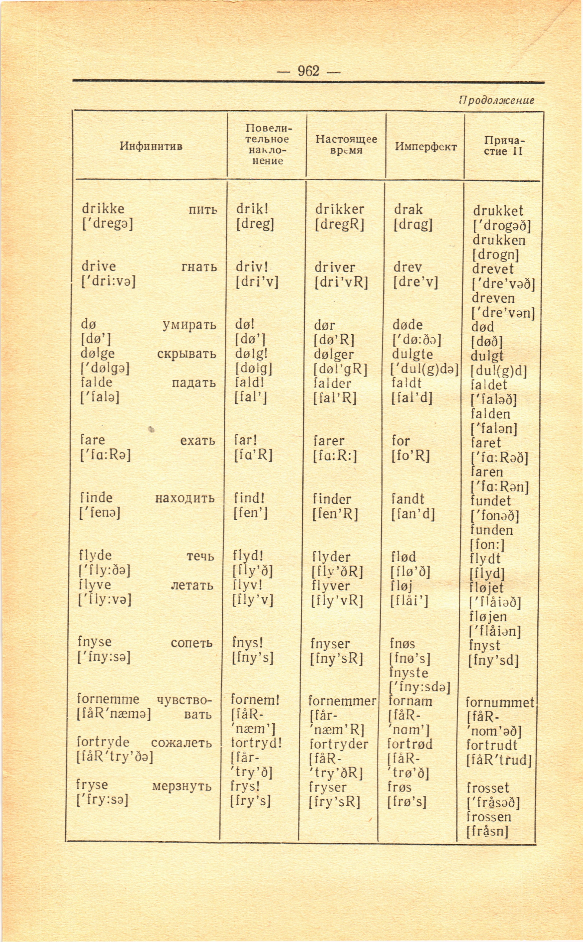 fryse мерзнуть [’fry:s3] frys! [fry’s] fryser [fry’sR] frøs [frø’s] frosset [’fråsaö] frossen [fråsn]