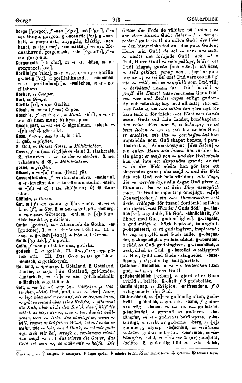 O saknar plur. † omljud. F familjärt. P lägre språk. ᚼ mindre brukl. ⚔ militärisk term. ⚓ sjöterm. ⚙ teknisk term.
