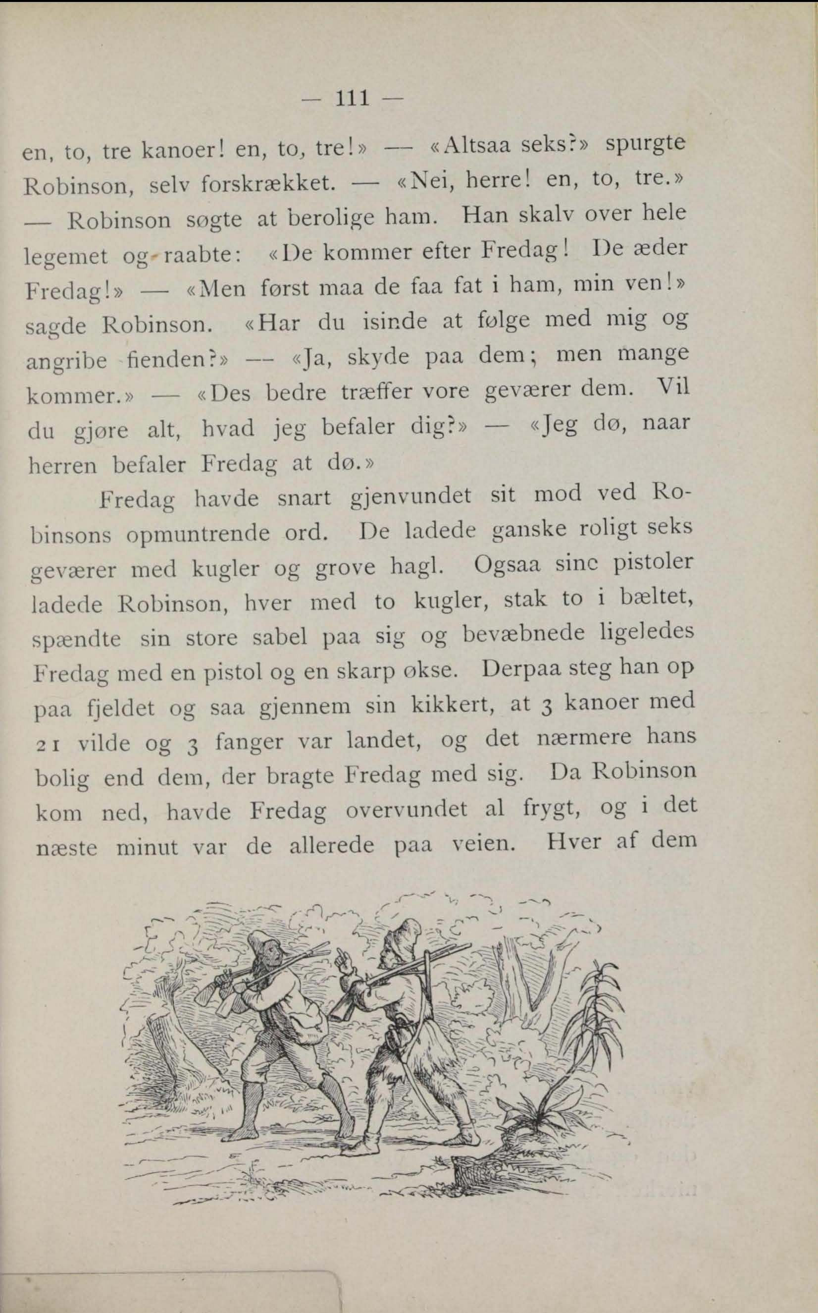 Robinson, selv forskrækket. — «Nei, herre! en, to, tre.»