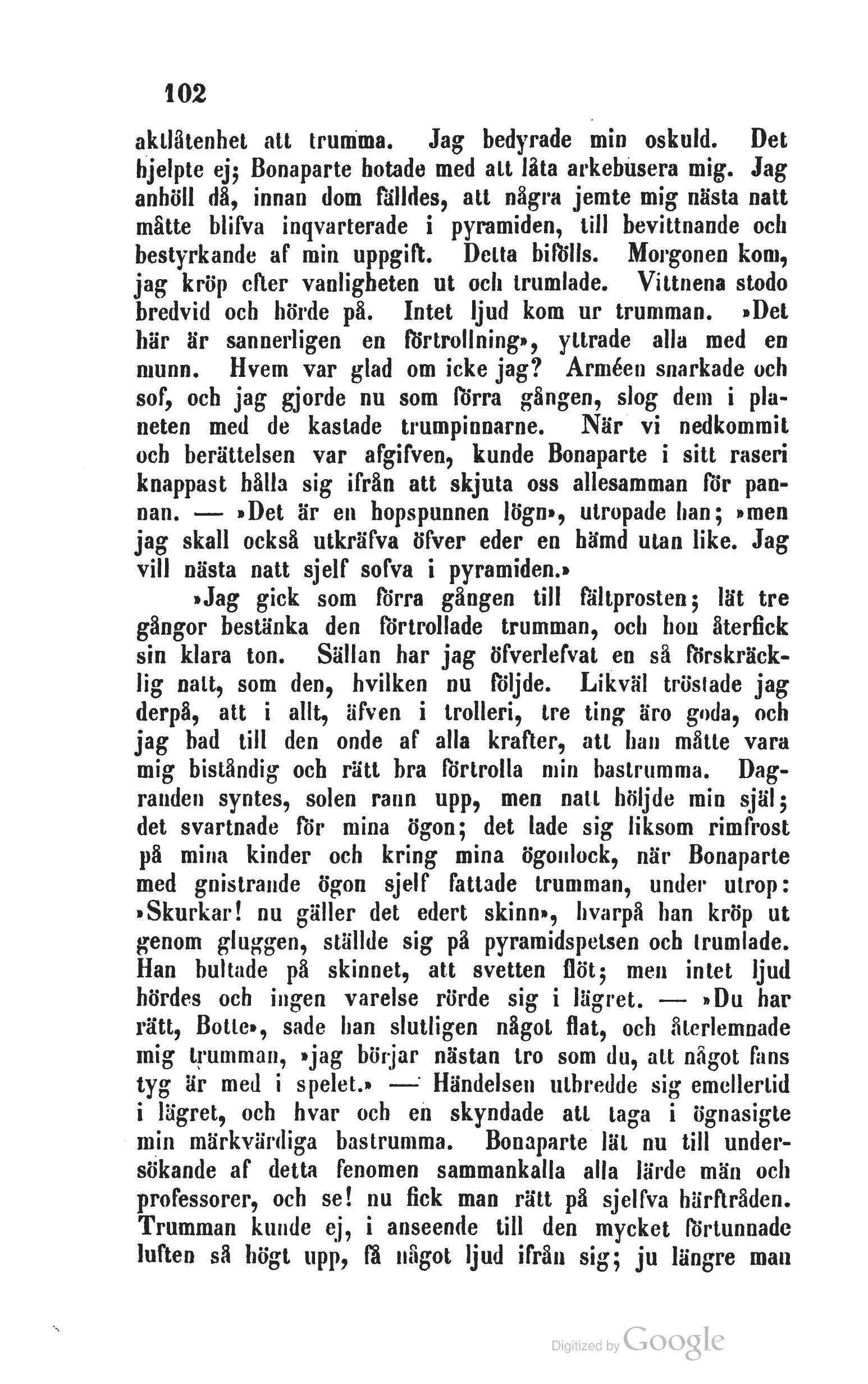 med gnistrande ögon sjelf fattade trumman, under utrop:
