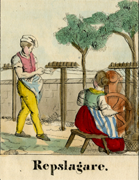 förfärdigar af hampa och lin rep, snören o. s. v., och platsen, der han arbetar, kallas repslagarbana.