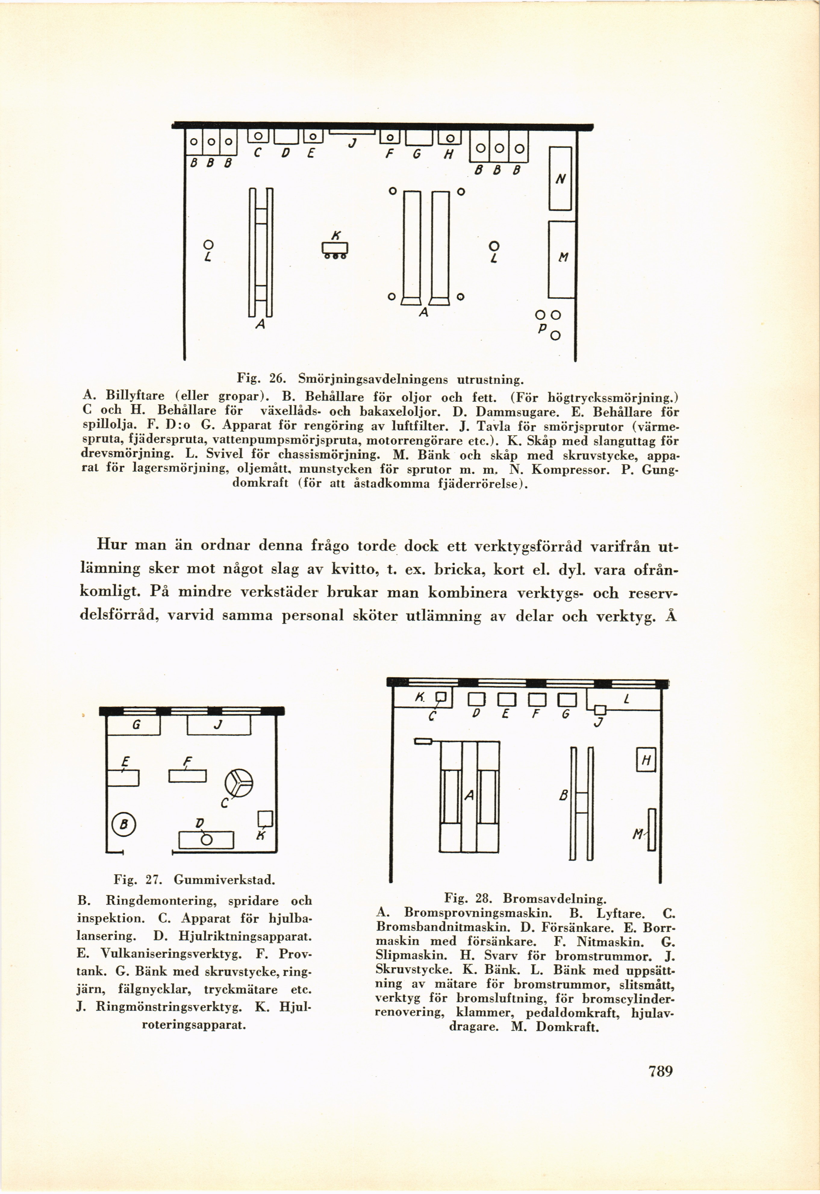 drevsmörjning. L. Svivel för chassismörjning. M. Bänk och skåp med skruvstycke,