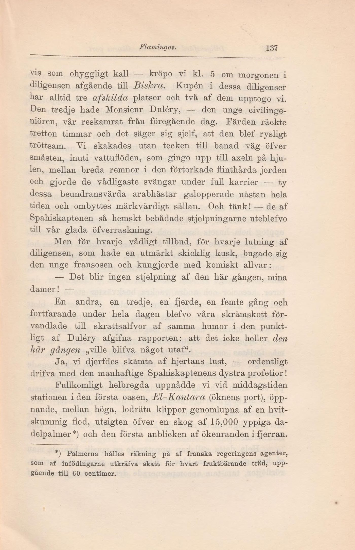 Full resolution (JPEG) - On this page / på denna sida - IV. Jernvägsfärd mellan Constantine och Batna. — Reskamrater. — En Spahis-kaptens skizzer och profetior. — Flamingos. — Diligensfärd till Biskra. — Öknens port. — Ankomst till Biskra. — Första kapplöpningsdagens slut. — Andra kapplöpningsdagen. — En Fantasia. — Tredje dagens fortsättning med kameler. — Vår altan i hôtel du Sahara. — Middag med „cousscoussou“. — Månskenet i Biskra.