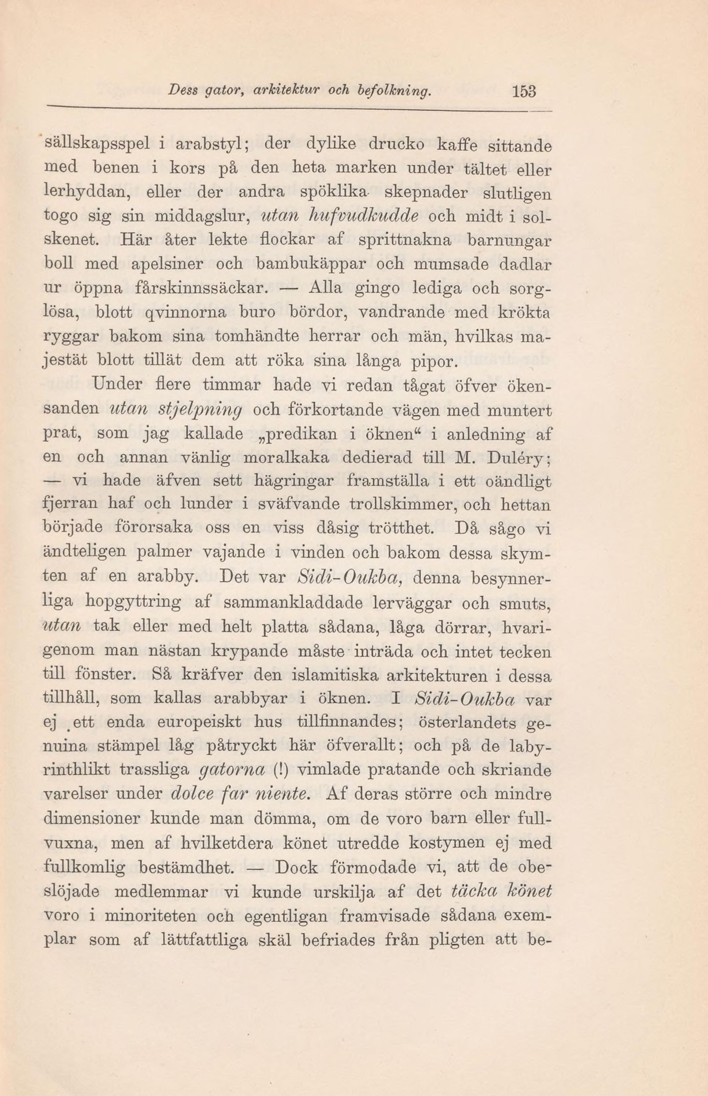 Full resolution (JPEG) - On this page / på denna sida - V. Ökenvandringar. — Sidi-Oukba. — Dess gator, arkitektur och befolkning. — Arabens takt och „savoir vivre“. — Tiggeriets industri, ett menskligt företräde framför djuret. — Diner under en dadelpalm. — Monsieur Landons trädgård. — Månskenspromenad i Biskra. — Arabiskt café med danserskor af Ouled-Naîl stammen. — Soiréer i öknen. — «Tusen och en natt«, berättad uppå originalspråket. — Varma svafvelbad. — Gamla Biskra. — Afsked från vår altan. — Återfärd mot norden.