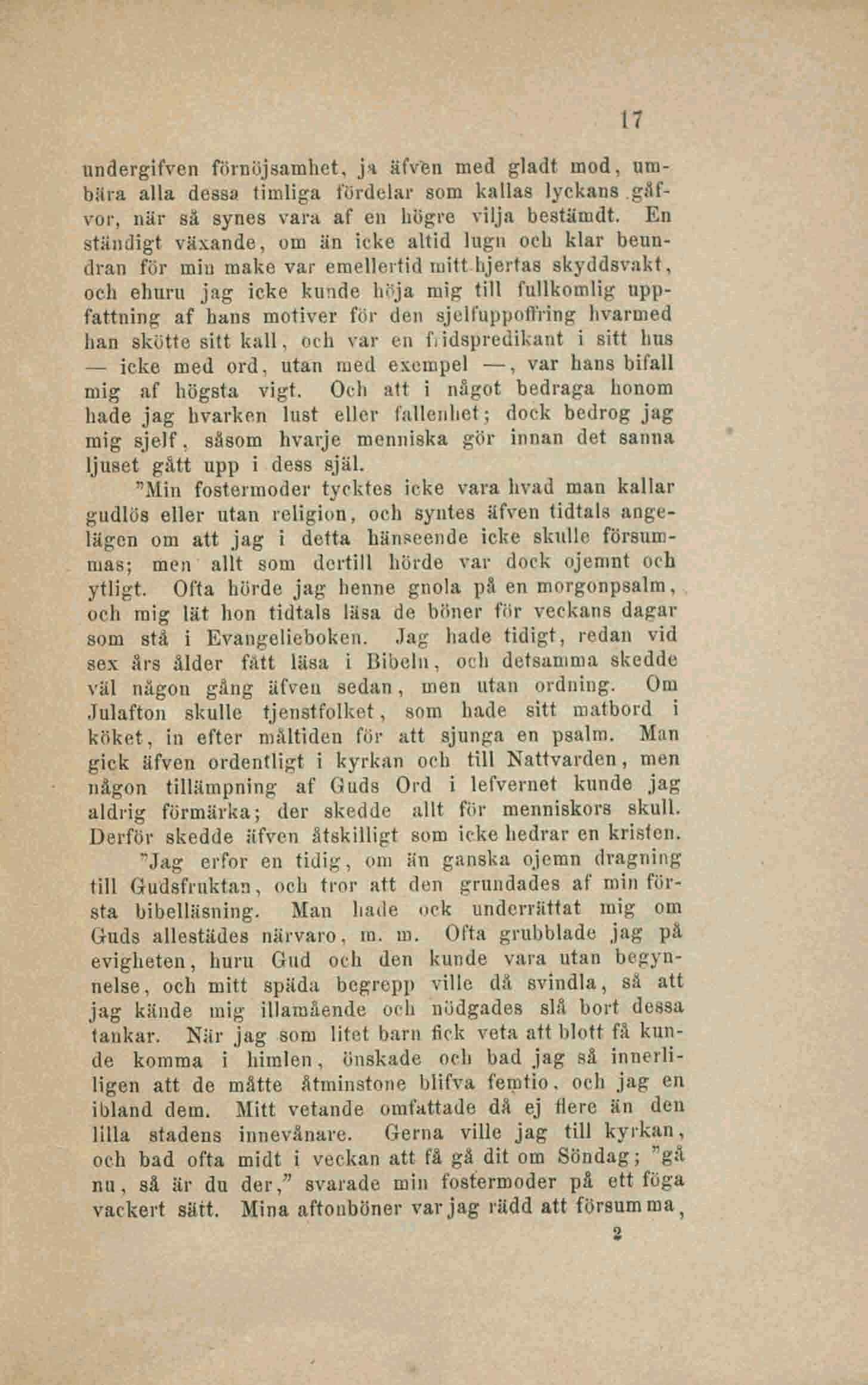 ytligt. Ofta hörde jag henne gnola på en morgonpsalm,