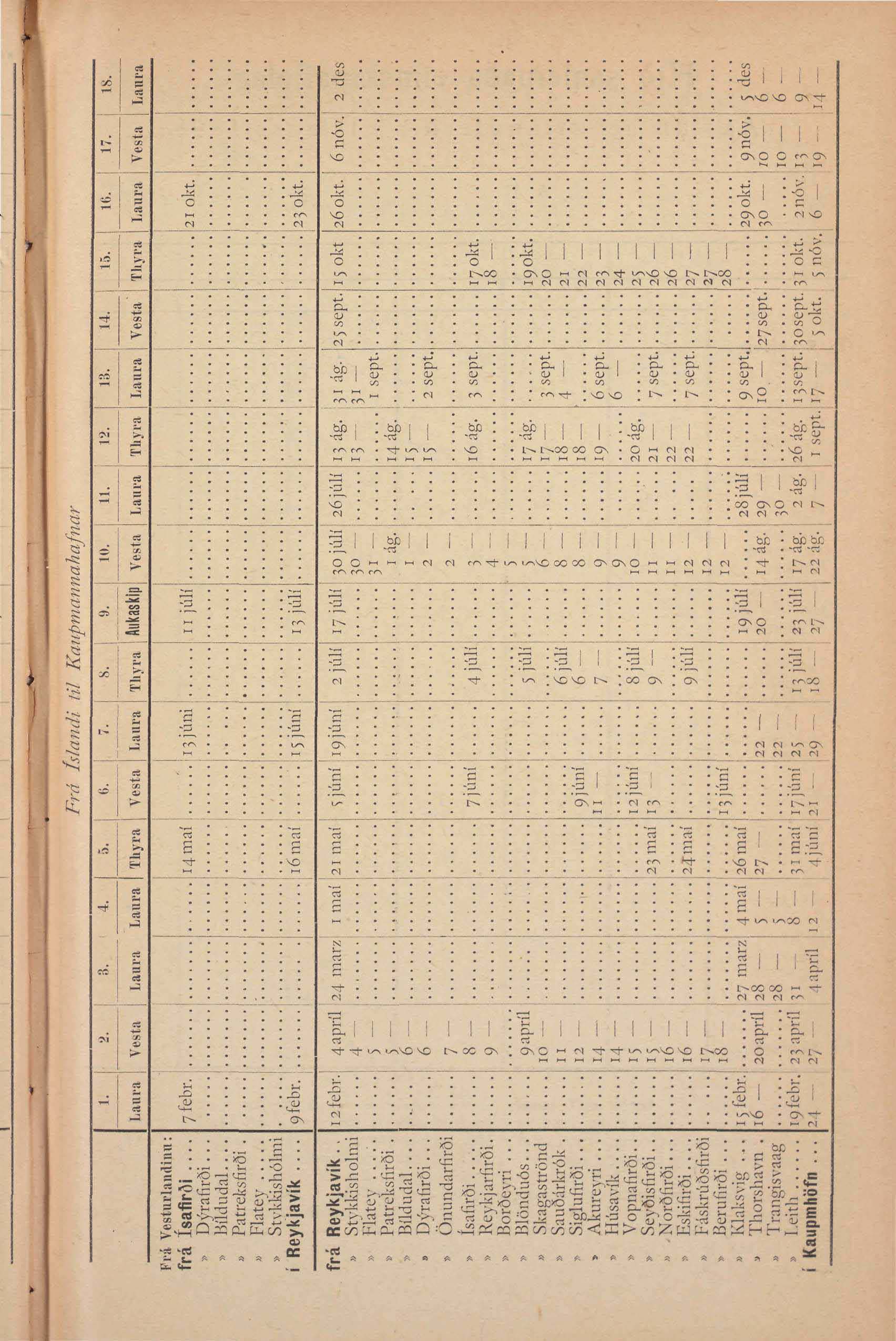 frá Reykjavik.. I2febr. 4apríl 24 marz 1 mai 21 mai s júní 19 júní 2 júlí 17 júlí I 30 júlí 26 júlí 13 ág. 31 dg. 25sept.i5okt 2Óokt. 6nóv. 2 des