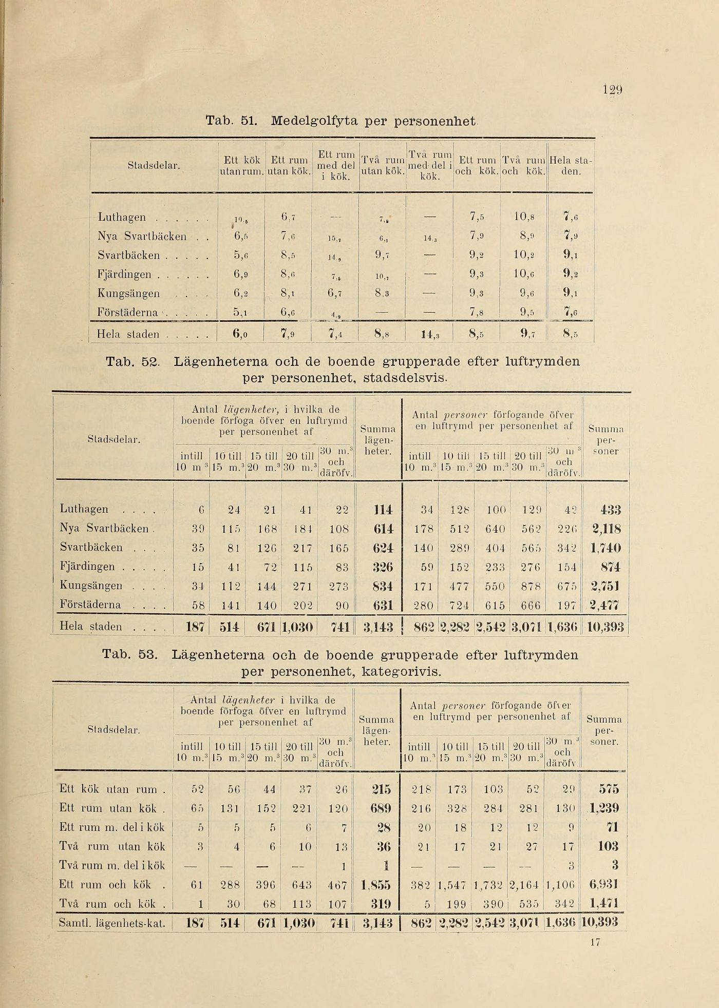 Tab. 52. Lägenheterna och de boende grupperade efter luftrymden