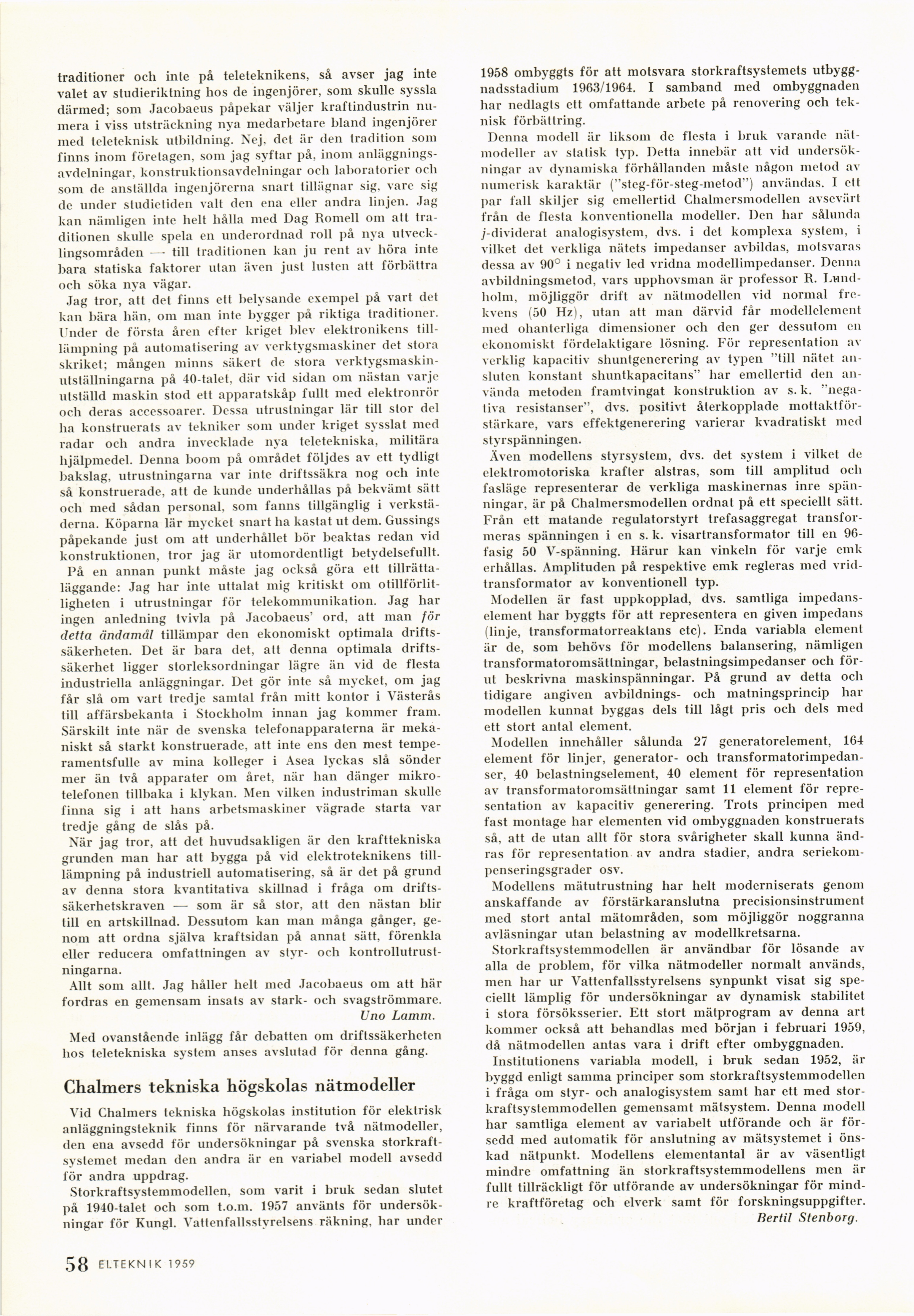 Full resolution (JPEG) - On this page / på denna sida - 1959, H. 4 - Teknisk debatt. Driftsäkerheten hos teletekniska system, av Uno Lamm - Chalmers tekniska högskolas nätmodeller, av Bertil Stenborg
