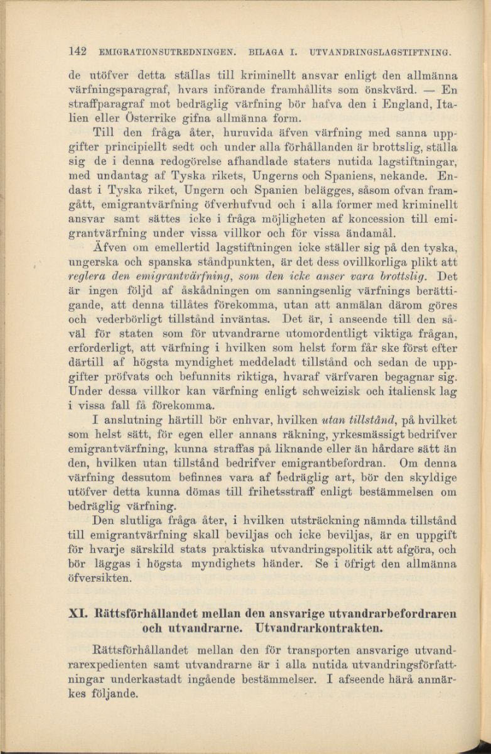 Full resolution (JPEG) - On this page / på denna sida - Särskild redogörelse för den nutida europeiska utvandringslagstiftningen - X. Utvandrarbefordrarnes och deras agenters affärsrörelse. Emigrantvärfning - XI. Rättsförhållandet mellan den ansvarige utvandrarbefordraren och utvandrarne. Utvandrarkontrakten