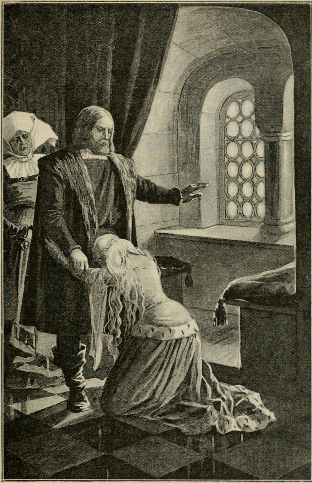 Ill. J. N.[=Jenny Nyström] »Stå upp, flicka», afbröt henne Engelbrekt med stränghet. (Sid. 283.) |