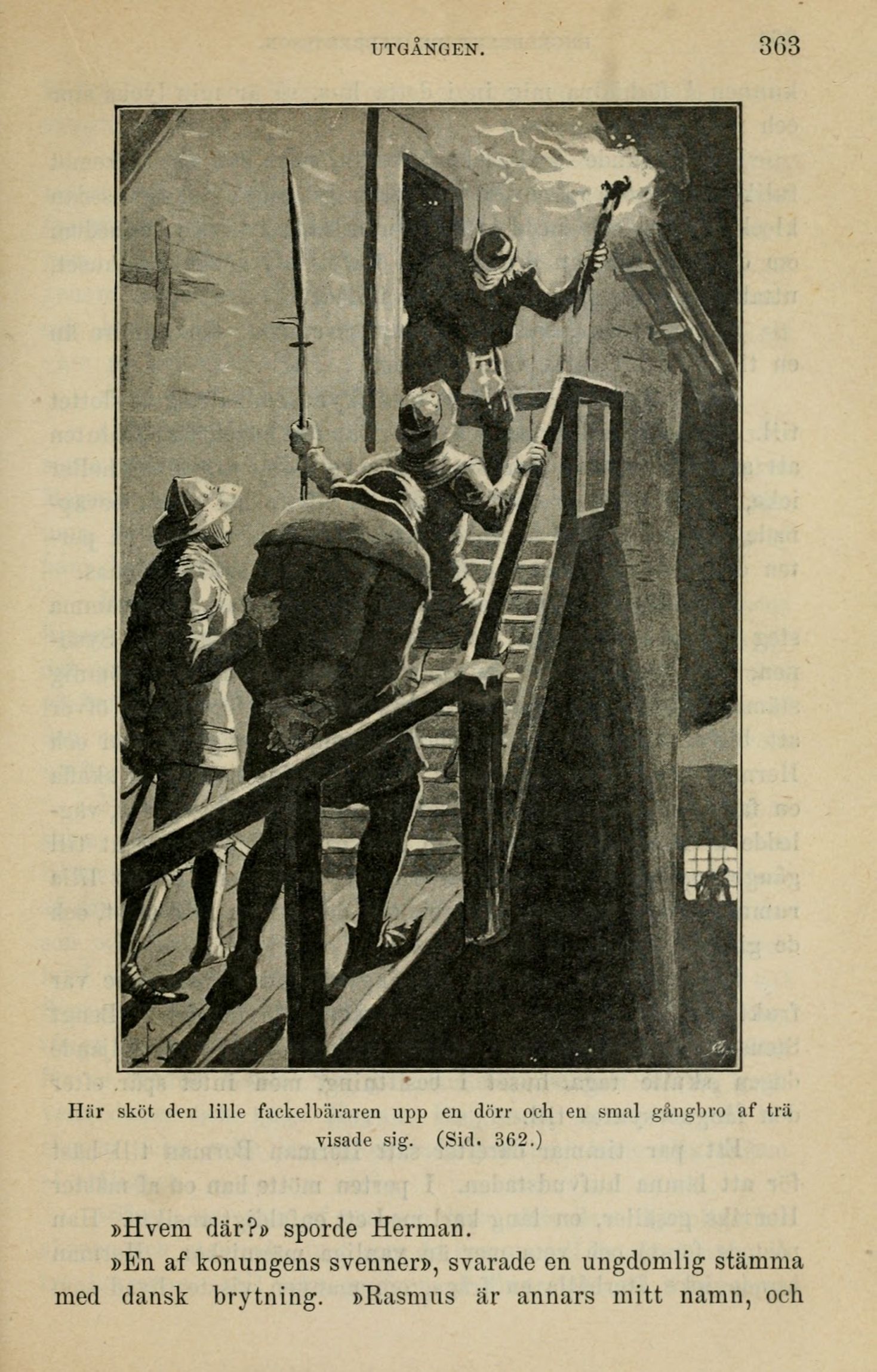 Ill. J. N.[=Jenny Nyström] Här sköt den lille fackelbäraren upp en dörr och en smal gångbro af trä visade sig. (Sid. 362.) |
