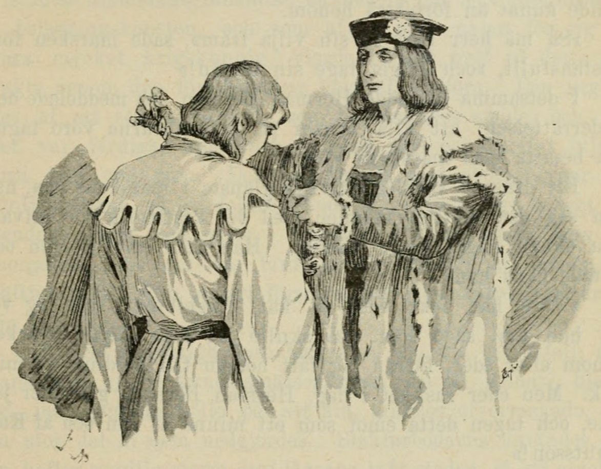 | Ill. J. N.[=Jenny Nyström] Han tog därmed en dyrbar guldkedja från sin hals och hängde den om Hermans. (Sid. 402.) |