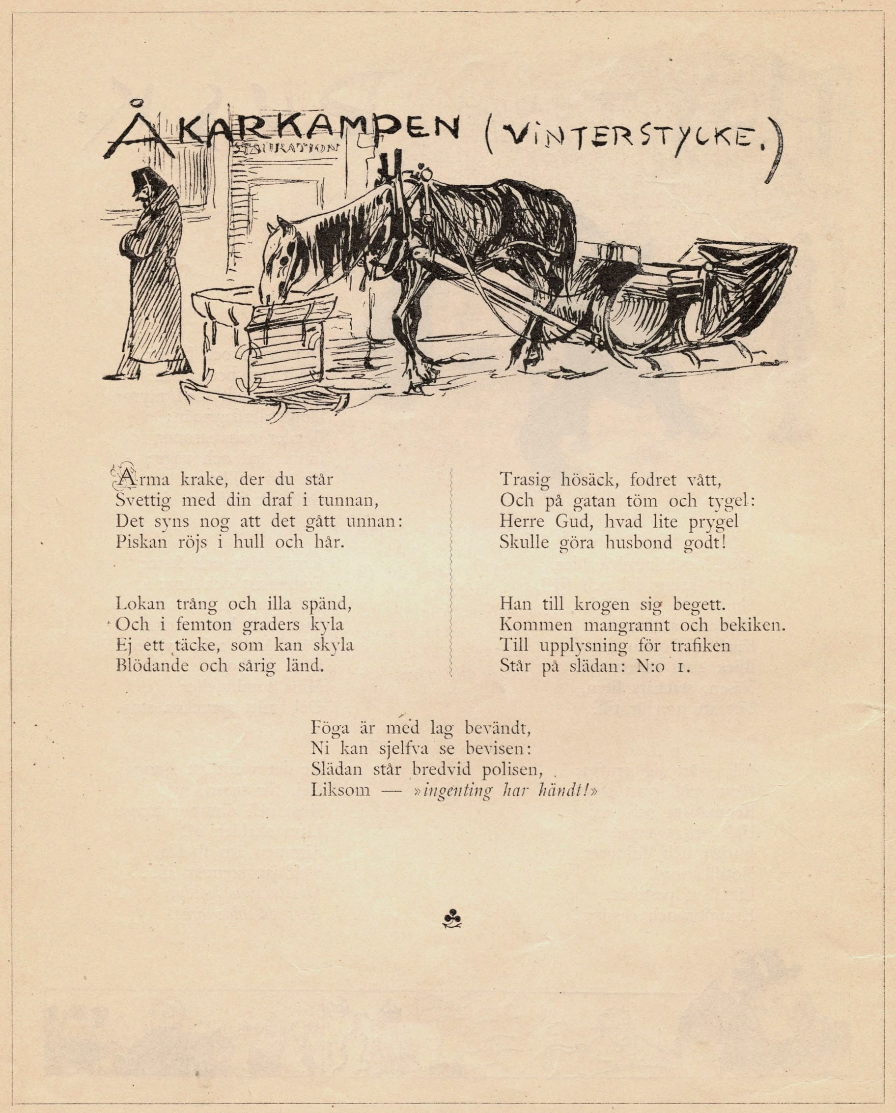 Arma krake, der du står Lokan trång och illa spänd, Trasig hösäck, fodret vått, Han till krogen sig begett. Föga är med lag bevändt, |