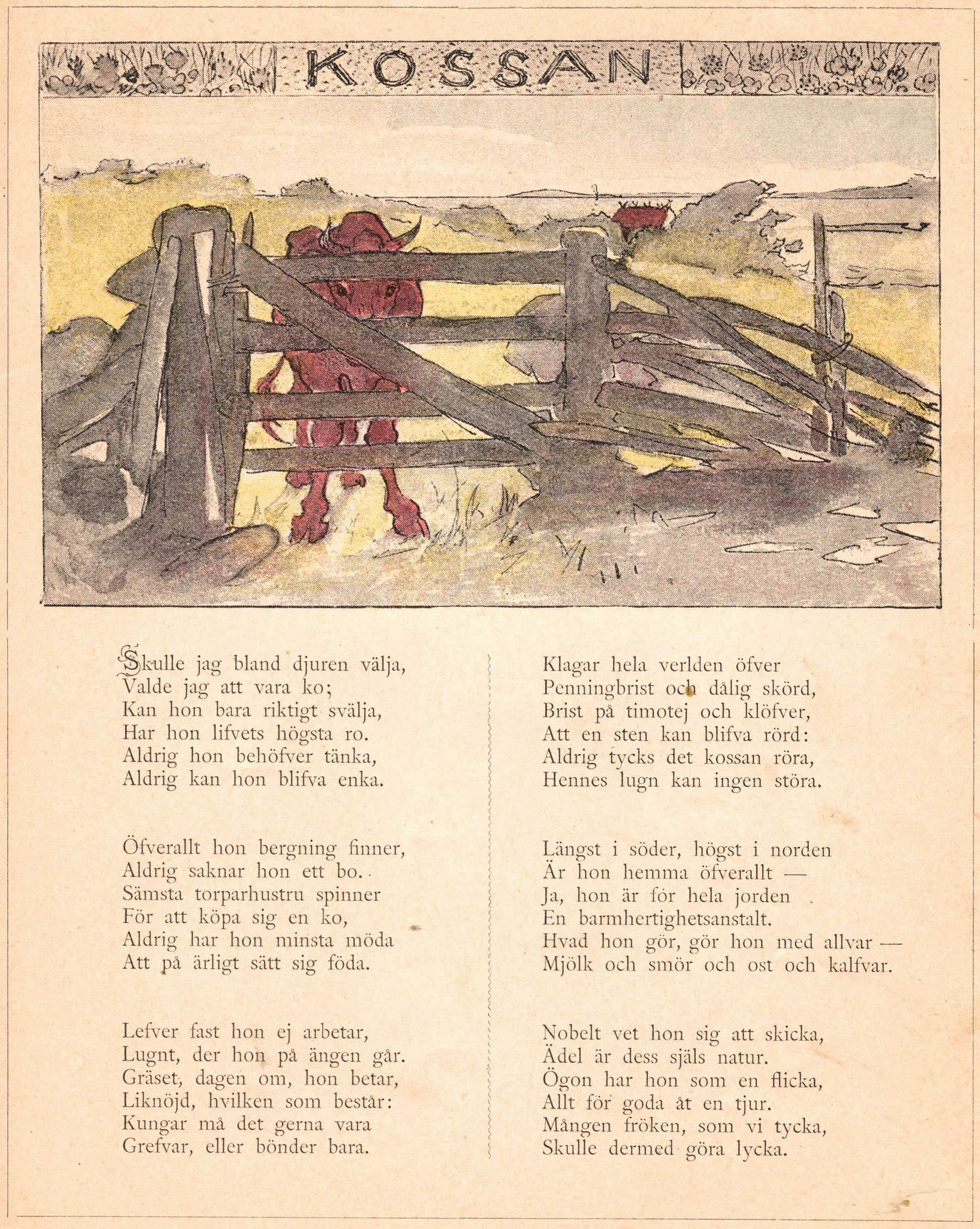 Skulle jag bland djuren välja, Öfverallt hon bergning finner, Lefver fast hon ej arbetar, Klagar hela verlden öfver Längst i söder, högst i norden Nobelt vet hon sig att skicka, |