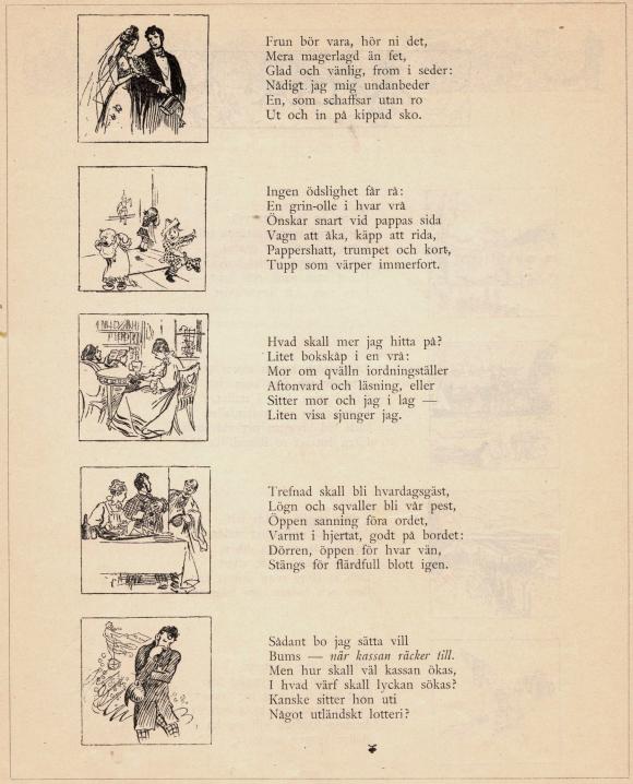 Frun bör vara, hör ni det, Ingen ödslighet får rå: Hvad skall mer jag hitta på? Trefnad skall bli hvardagsgäst, Sådant bo jag sätta vill |