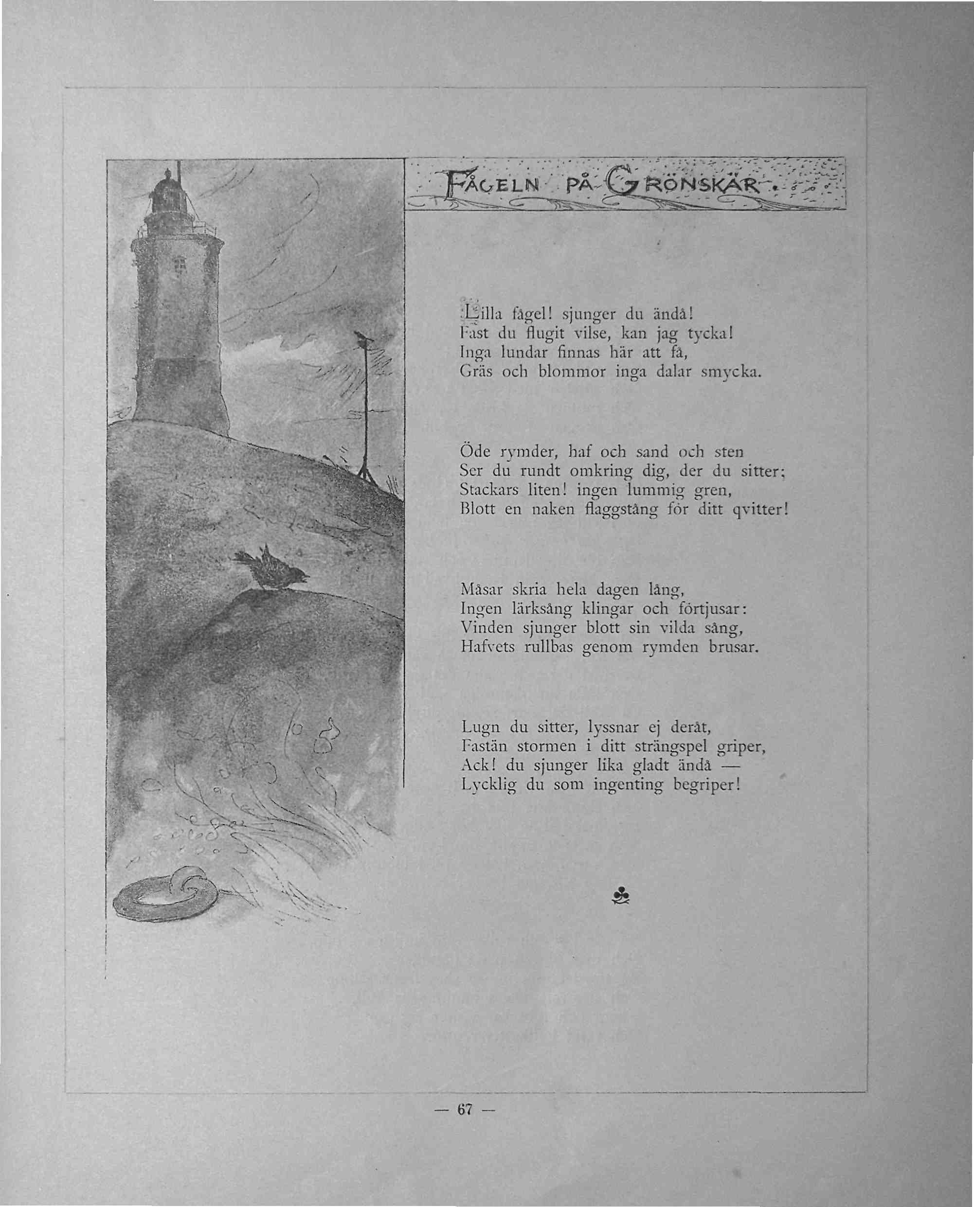 Lilla fågel! sjunger du ändå! Öde rymder, haf och sand och sten Måsar skria hela dagen lång, Lugn du sitter, lyssnar ej deråt, |