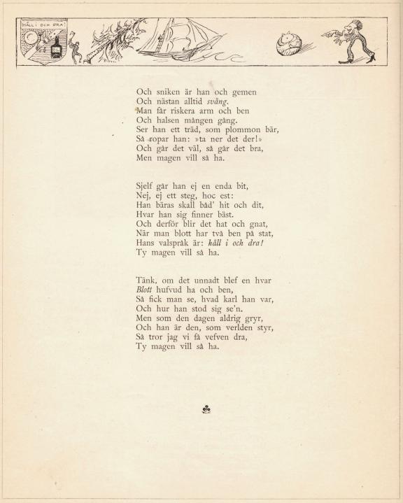 Och sniken är han och gemen Sjelf går han ej en enda bit, Tänk, om det unnadt blef en hvar |