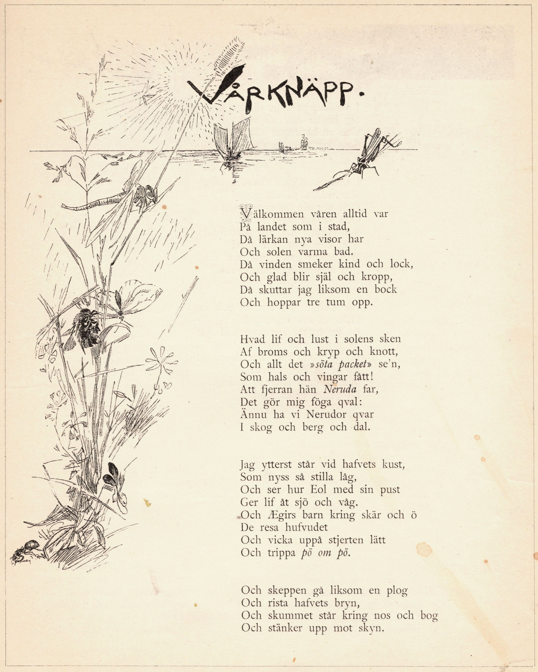 Välkommen våren alltid var Hvad lif och lust i solens sken Jag ytterst står vid hafvets kust, Och skeppen gå liksom en plog |
