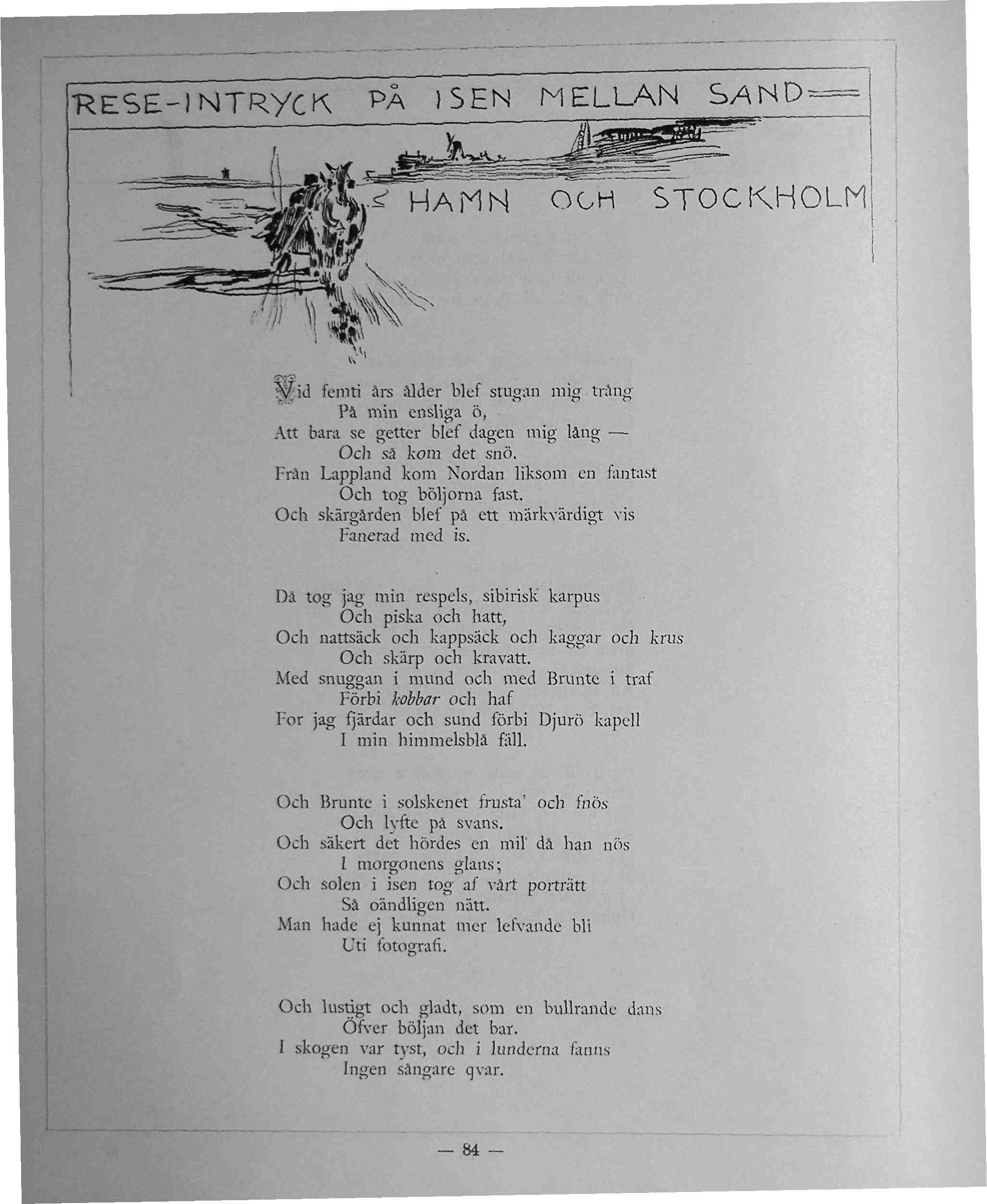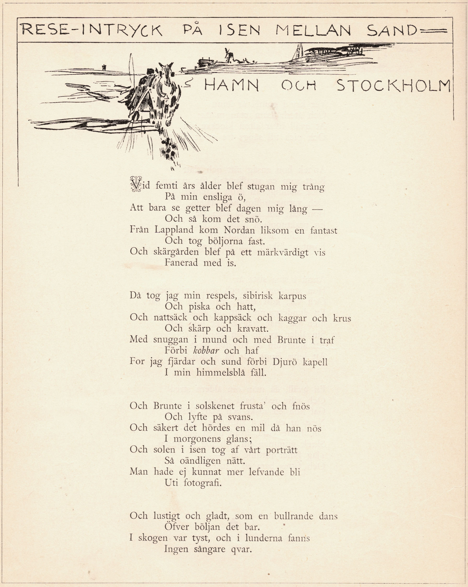 Vid femti års ålder blef stugan mig trång Då tog jag min respels, sibirisk karpus Och Brunte i solskenet frusta’ och fnös Och lustigt och gladt, som en bullrande dans |